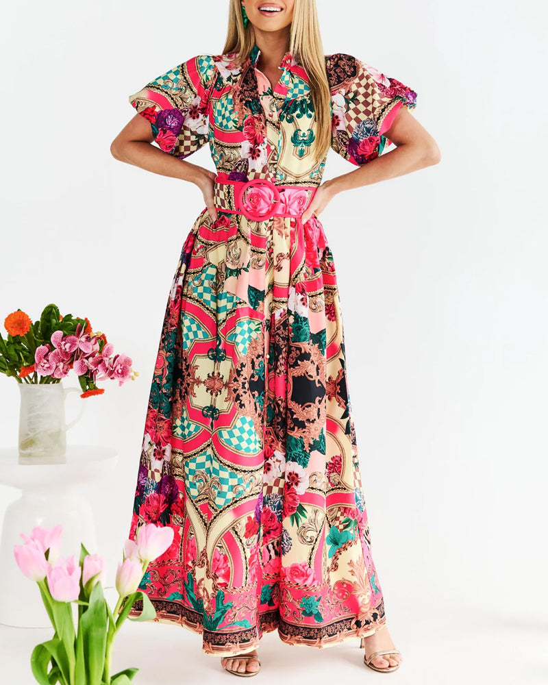 Elegant Lapel Printed Belt Dress