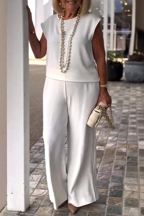 Solid Color Crew Neck Sleeveless Top and Pocket Straight Leg Pants Set