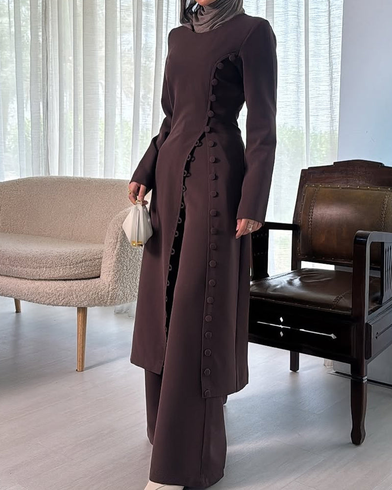 Solid Color Crewneck Trousers Button-Detail Top & Pants Two-Piece Set