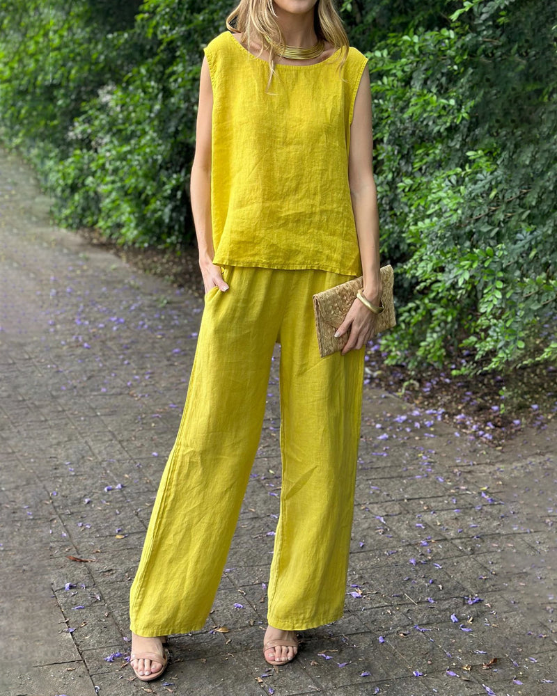 Solid Cotton Linen Sleeveless Vest & Pants Two-Piece Set