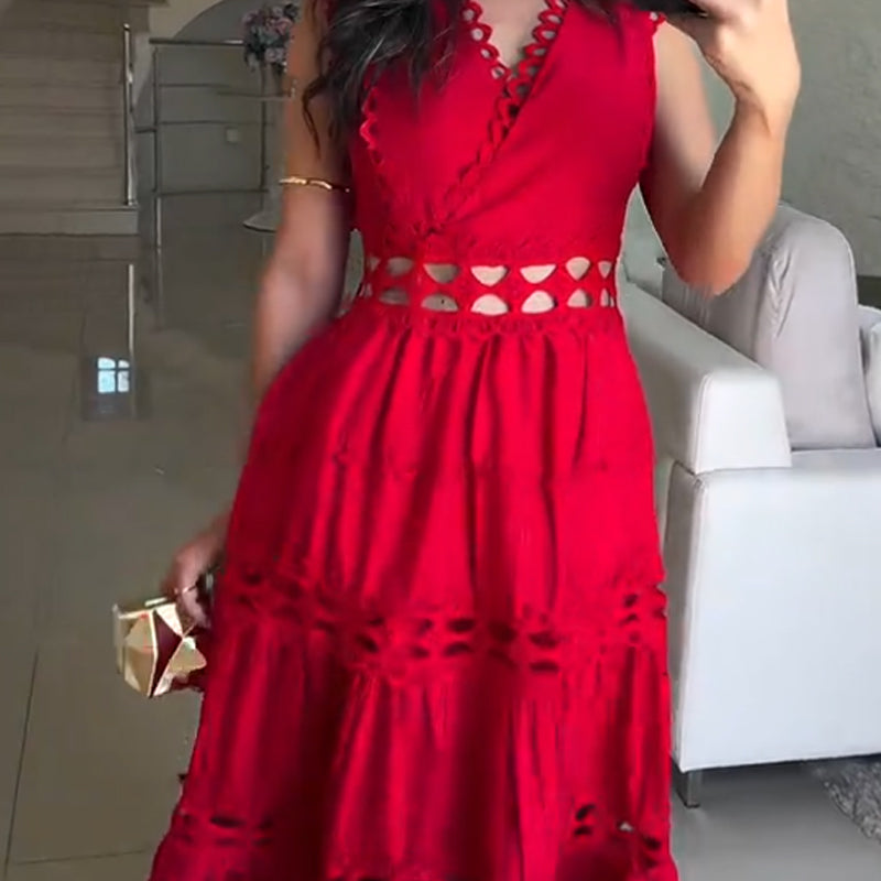 Solid Color V-Neck Sleeveless Openwork Design Dress