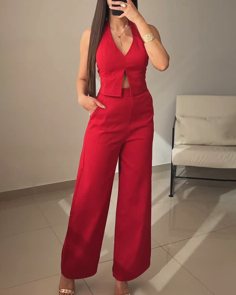 Solid-Color Irregular Halter Top & Casual Pants Set