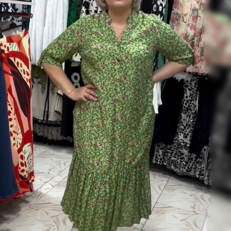 Women's Loose Dress With Deep V-Neckline And Print