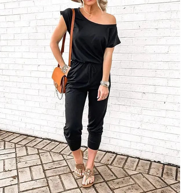 Women's Loose Solid Off Shoulder Elastic Waist Stretchy Long Romper Jumpsuit