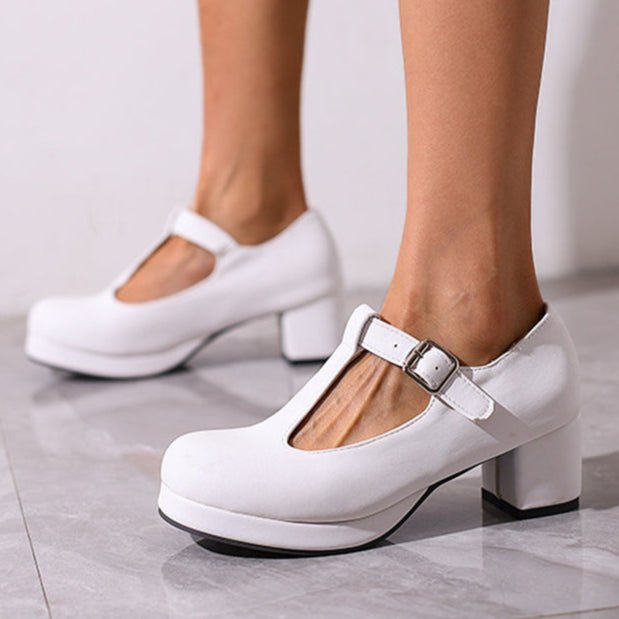 Women's Platform Chunky Heel T-Strap Pumps