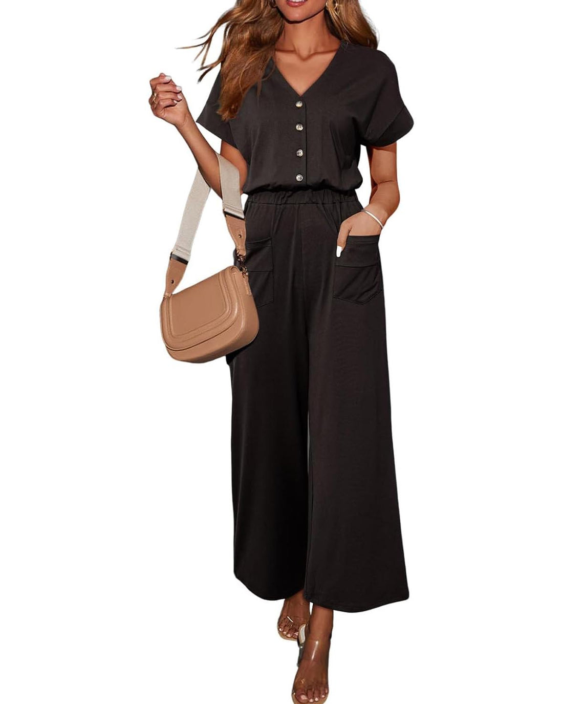 Women's Short Sleeves Button Down Wide Leg Jumpsuits with Pockets