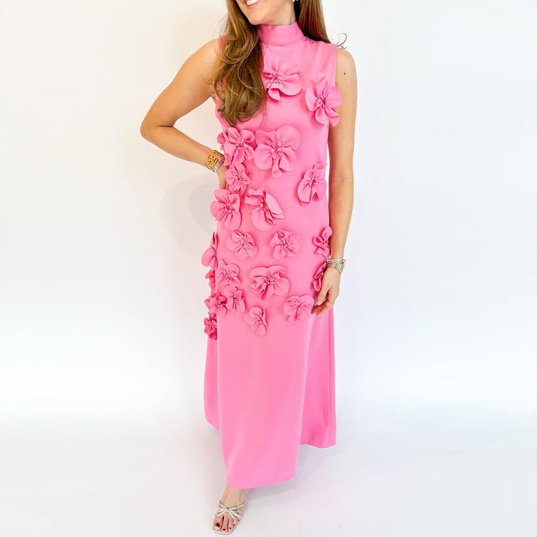 Elegant Sleeveless Mock Neck 3D Floral Maxi Dress
