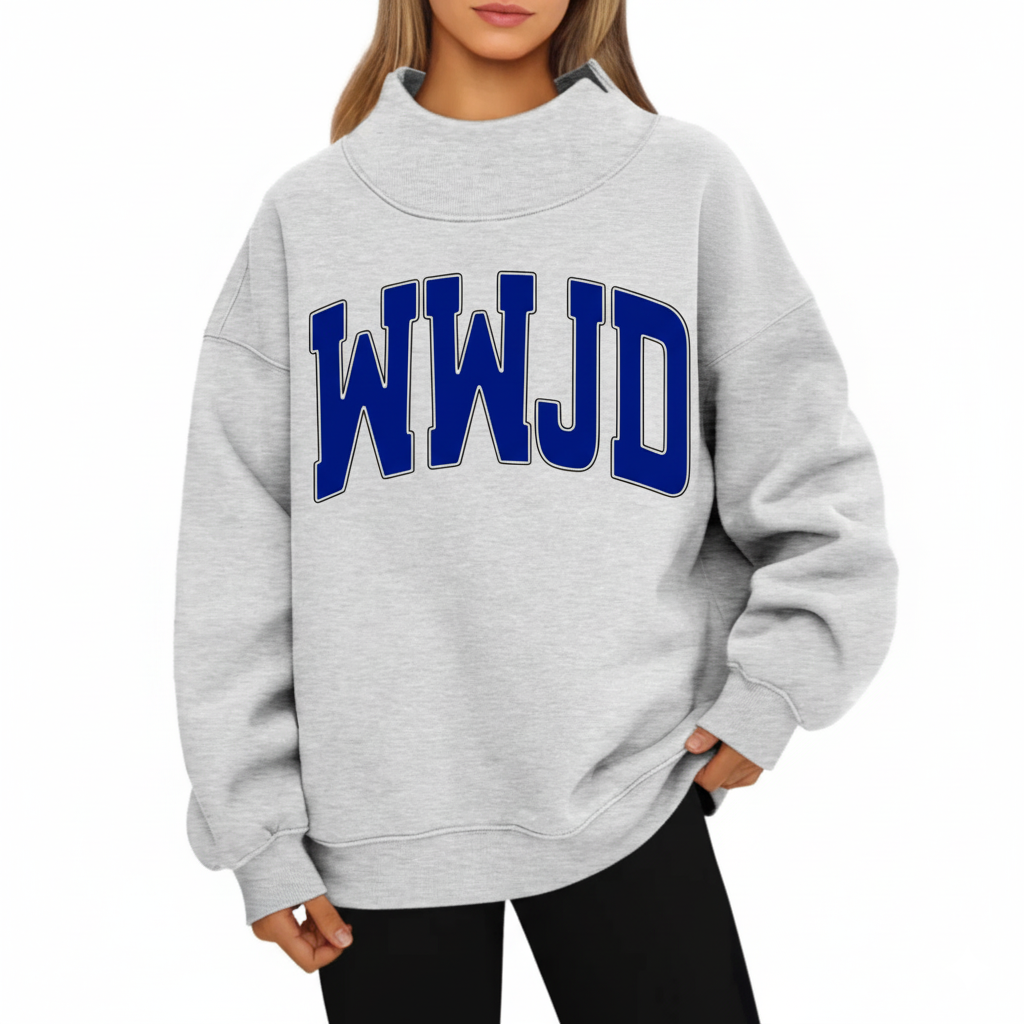 Cozy Mock Neck "WWJD" Printed Sweatshirt