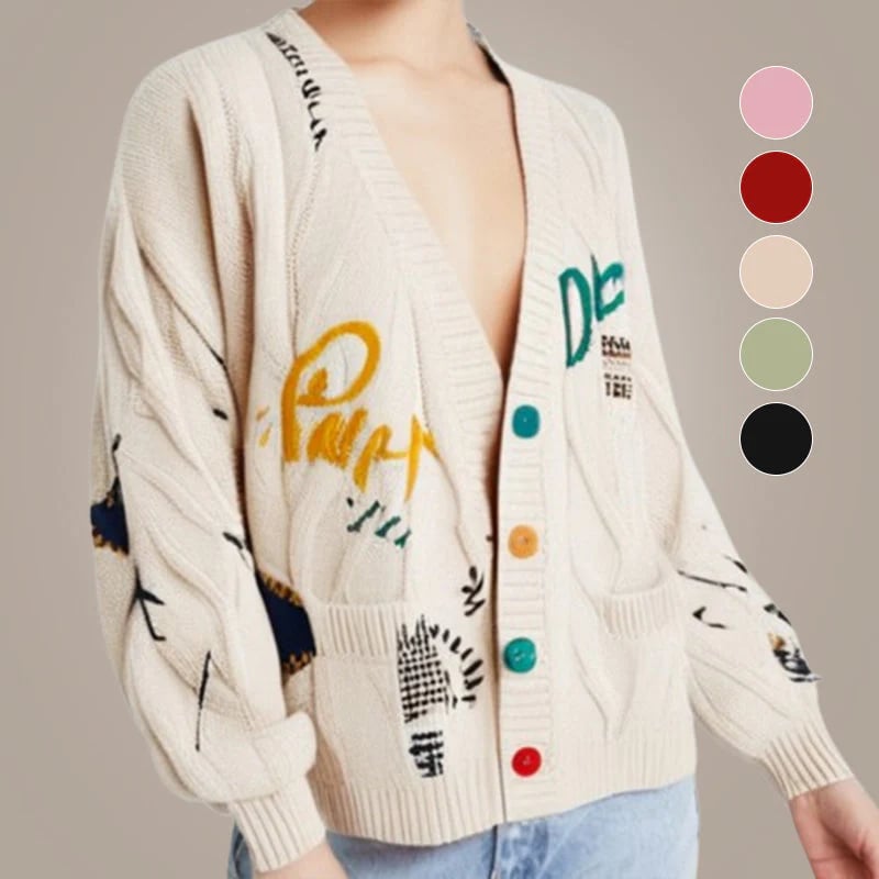 Women's V-Neck Embroidered Sweater with Buttons