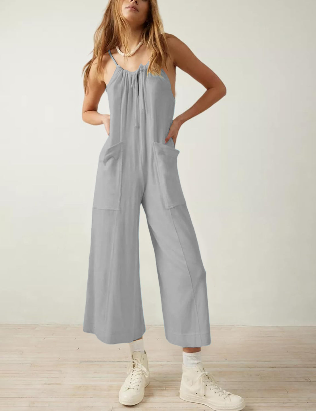 Women's Casual Drawstring Sleeveless Loose Jumpsuit with Pockets