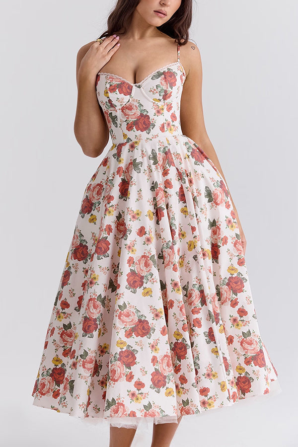 Floral Print Heart Shaped Lace Up V Neck Printed Dresses