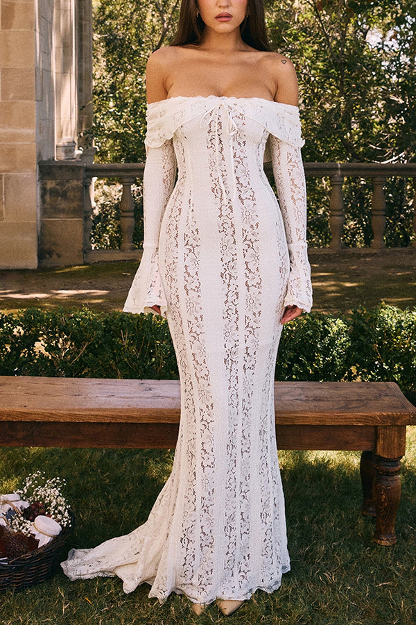 Floral Lace Off Shoulder Bell Sleeve Stretch Maxi Dress