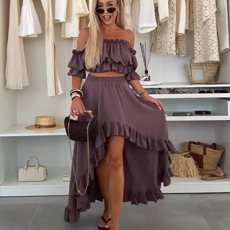 Ruffled Off-Shoulder Crop Top with Asymmetrical Midi Skirt Set