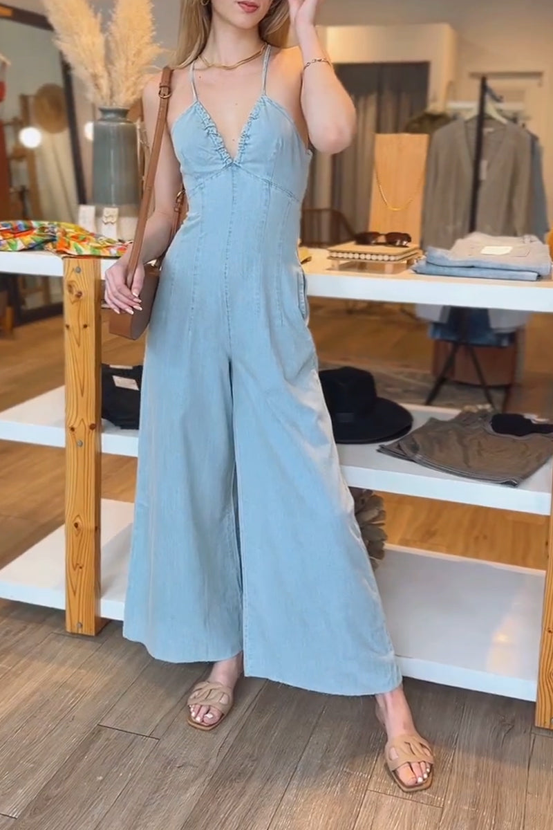 Women’s Sleeveless V-Neck Wide Leg Jumpsuit with Waist Belt