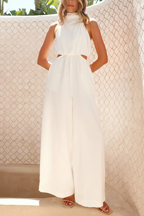 Solid Color Resort Style Halter Neck Waist Pocket Wide Leg Jumpsuit