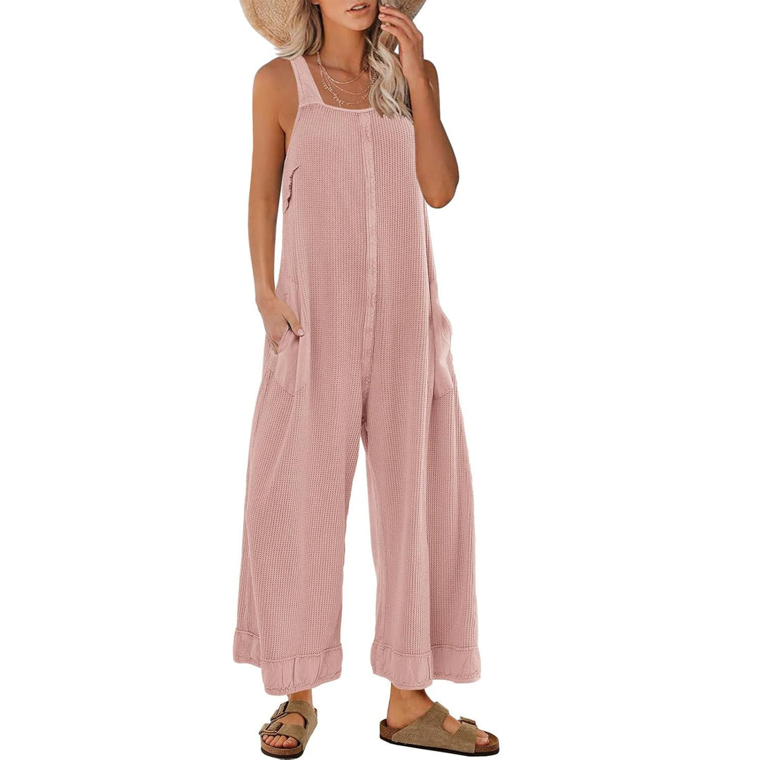 Womens Open Back Wide Leg Jumpsuits Sleeveless Waffle Knit Romper