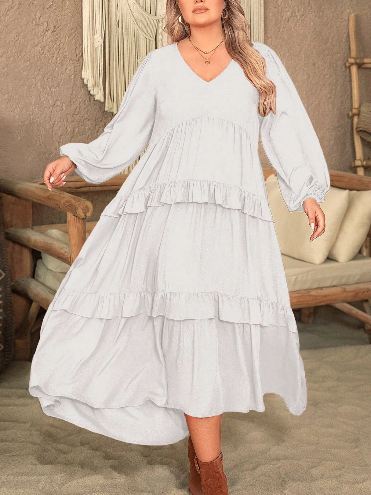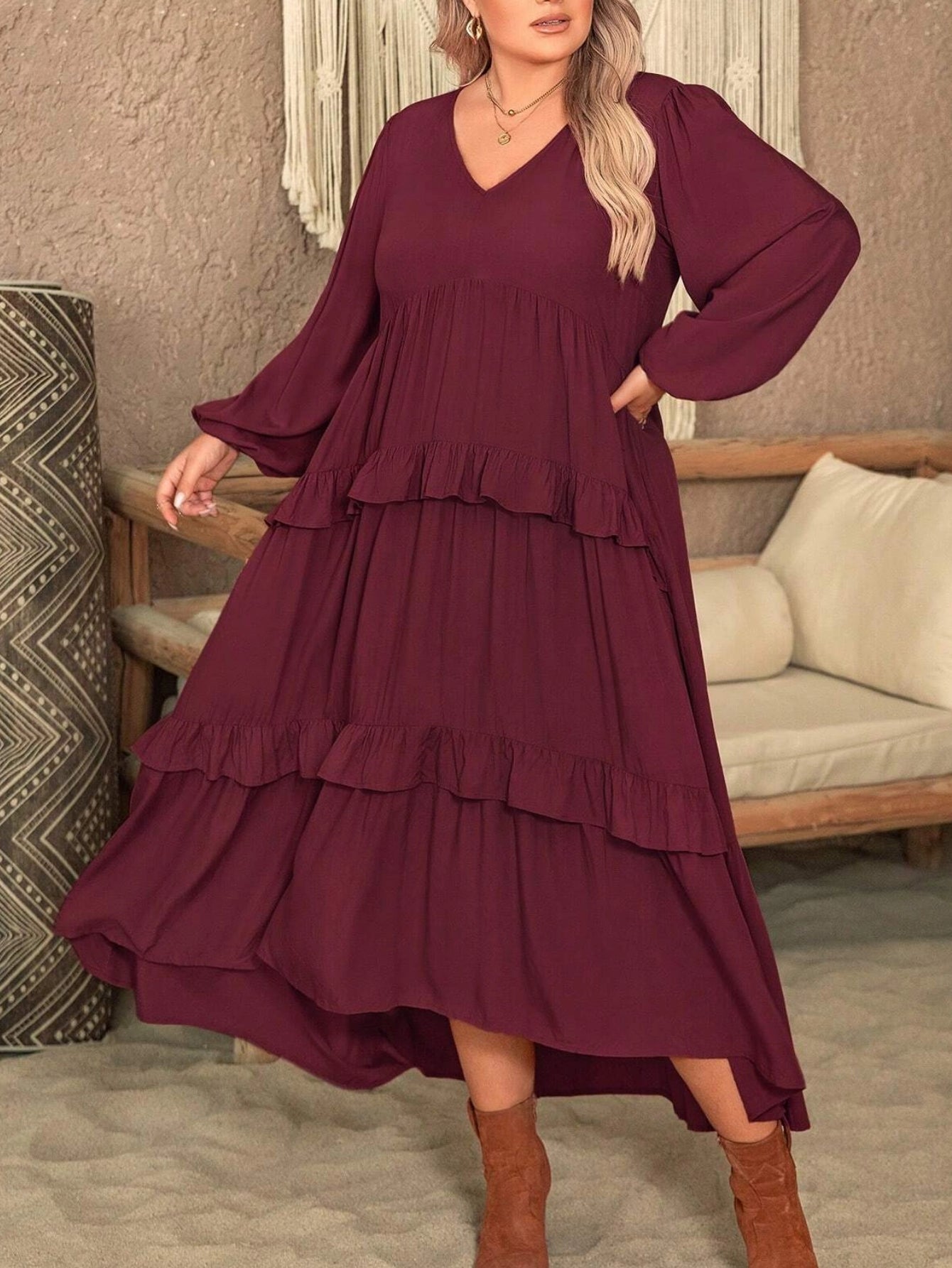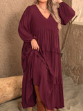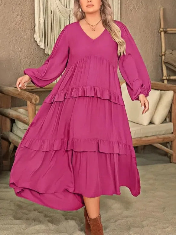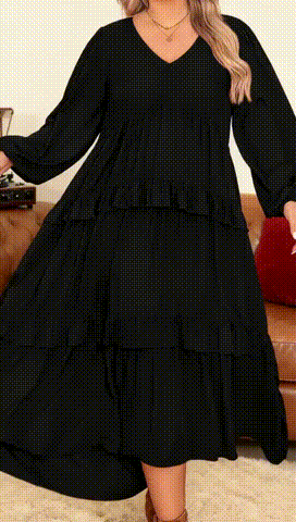 Elevate your wardrobe with this women's V-neck solid color long-sleeved dress, featuring elegant layered ruffles for a chic touch. Enjoy effortless style and comfort—buy two and receive free shipping.