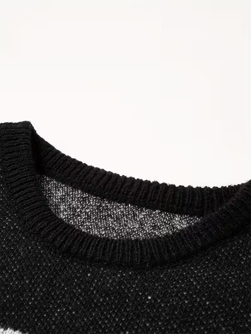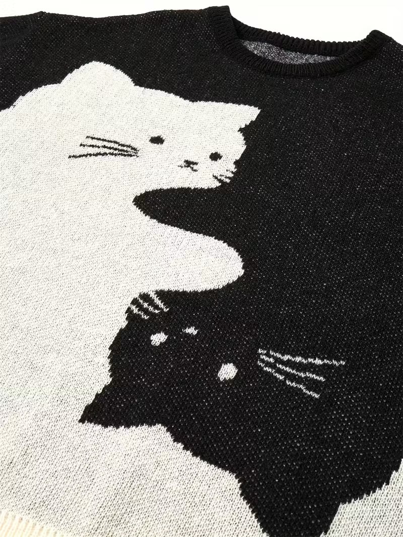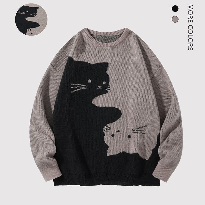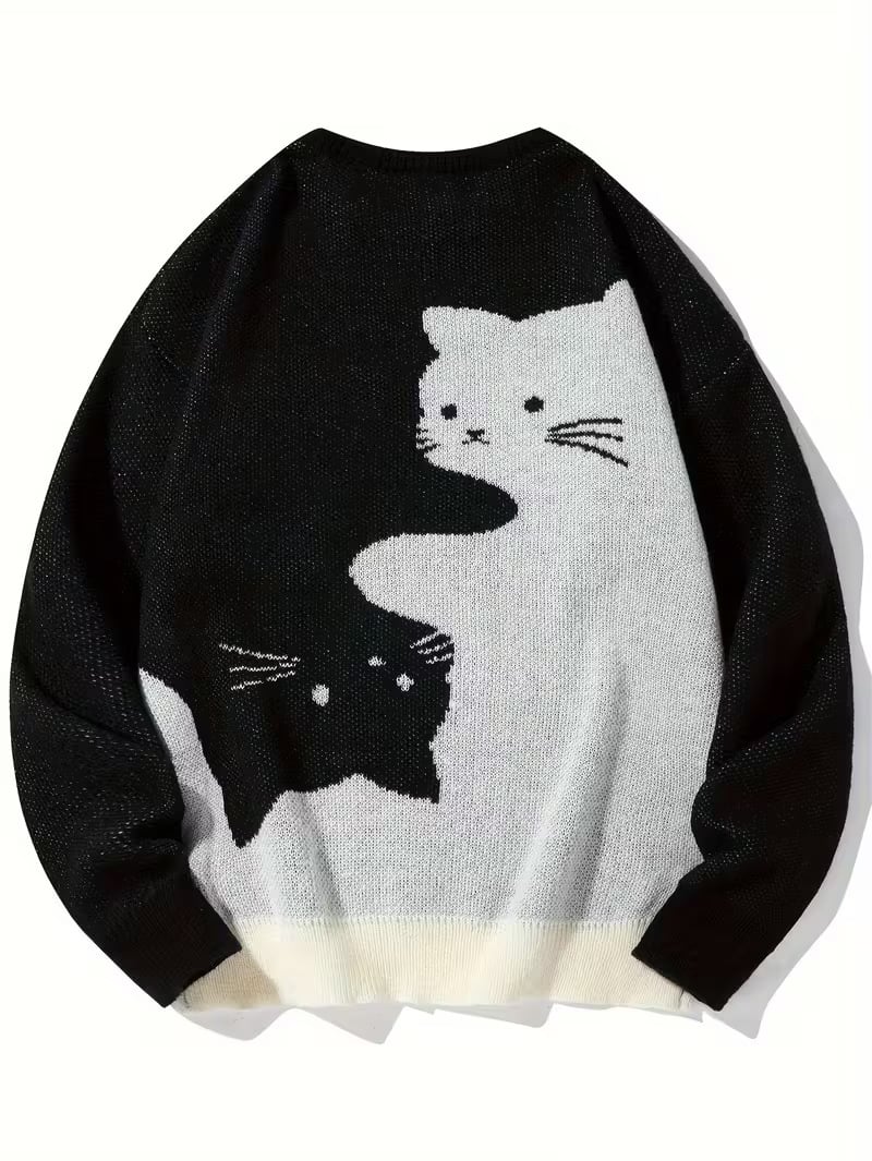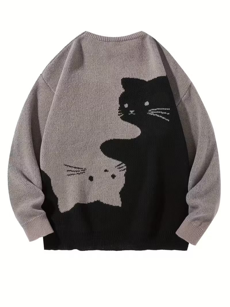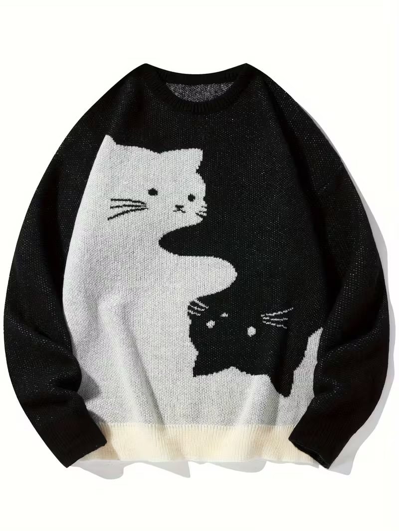Love Love Men's Cartoon Cat Jacquard Round Neck Sweater Loose Casual