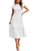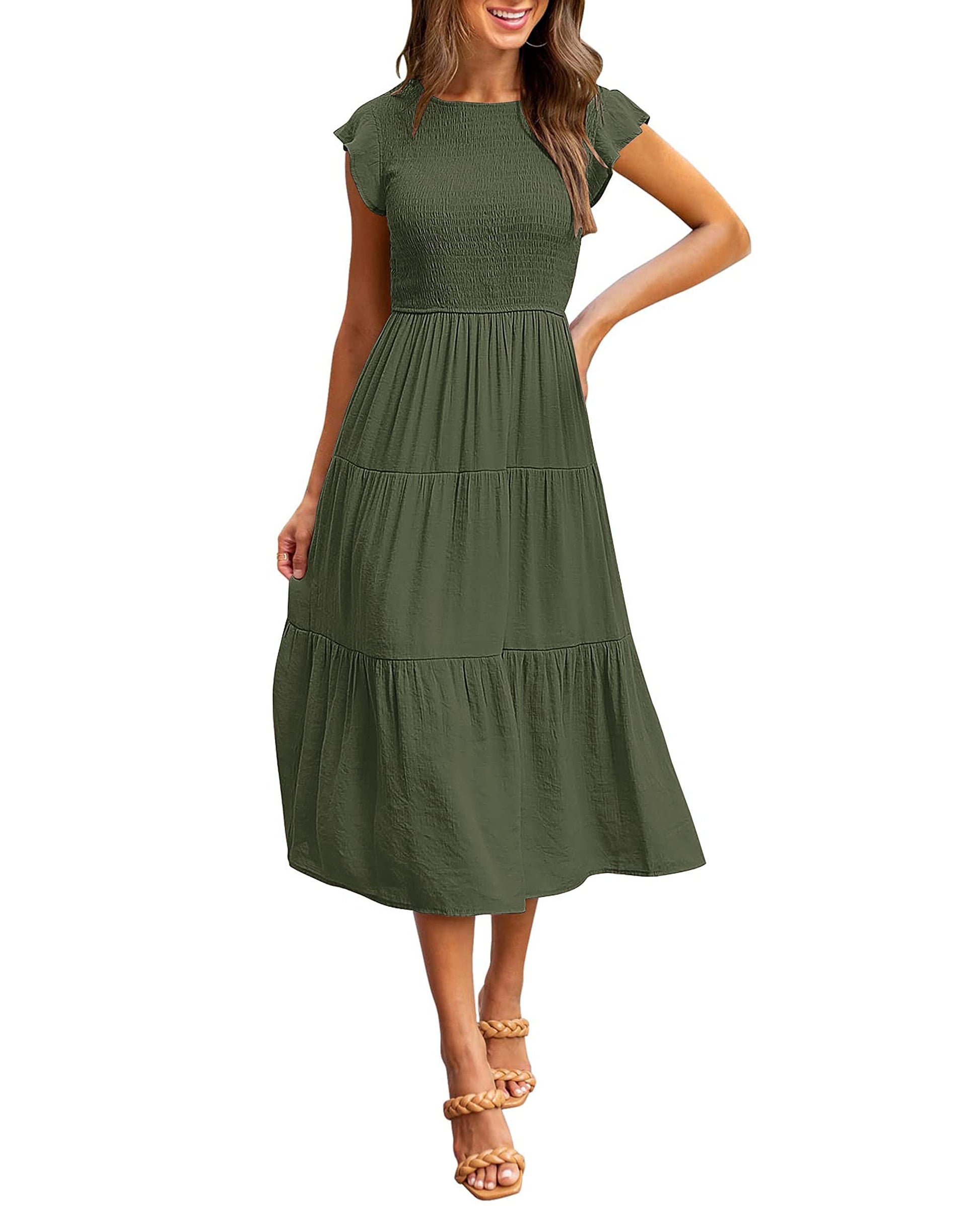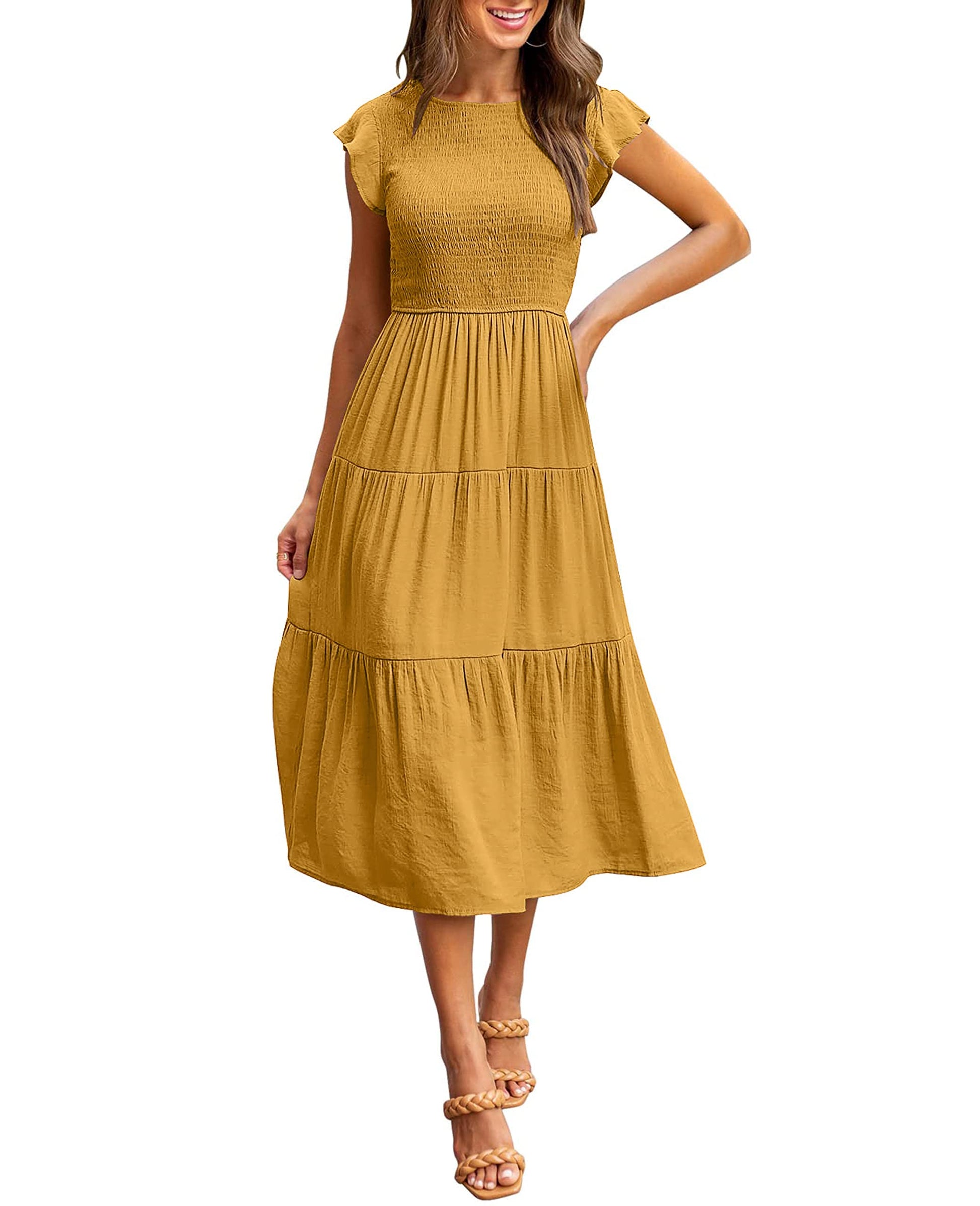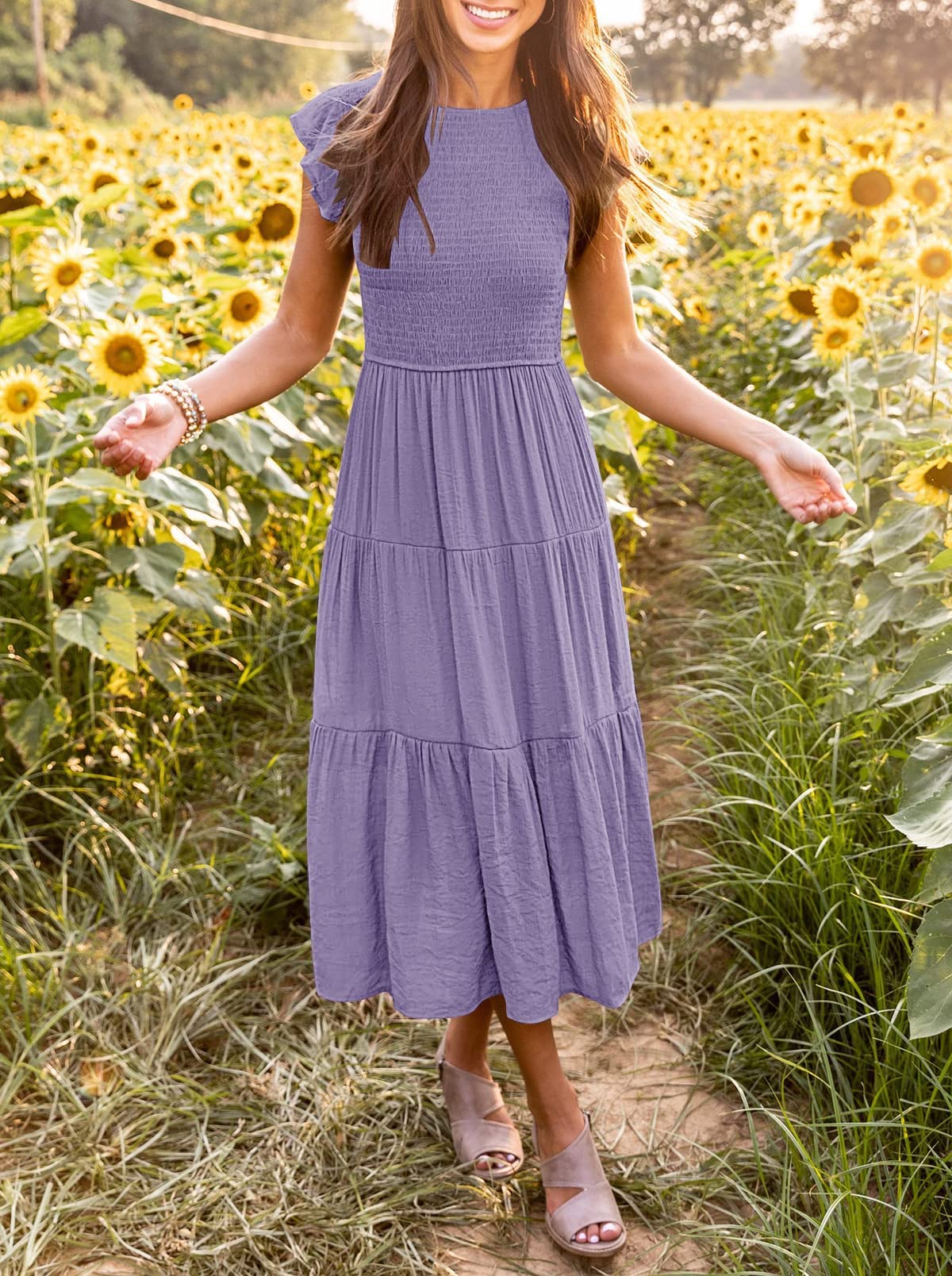 This bold and breezy midi dress has a flattering elastic shirred top, features a crew neck, solid color, high waist, short cap sleeves, edged with playful frills at shoulder, back key-hole closure and a flowy tiered midi skirt, adds more feminine.