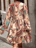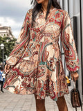 This bohemian dress features an elegant judge's collar, giving it a stylish and modern look. Ruffle details accentuate the dress's romantic and feminine lines. A belt detail highlights the waistline, showcasing the wearer's graceful curves.