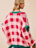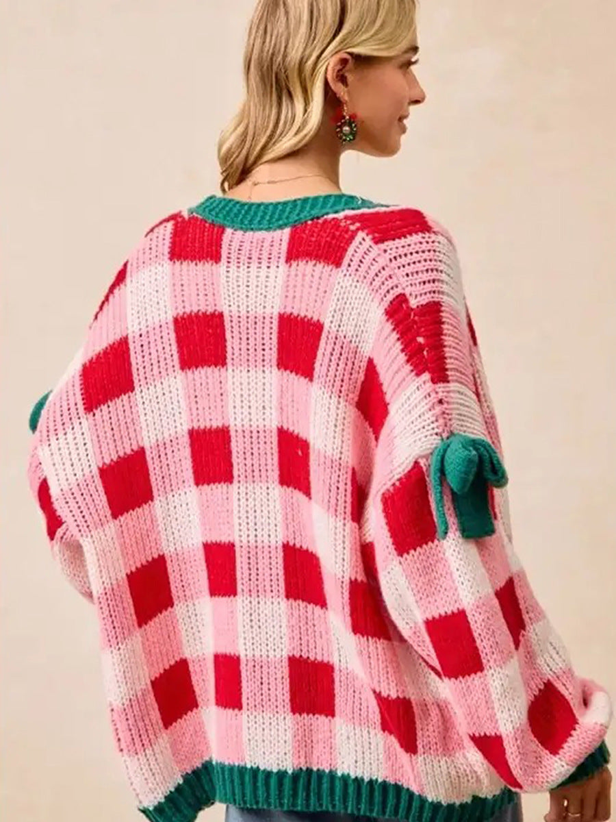 Constructed from a soft 100% polyester knit, the cardigan provides warmth without irritation. The checkered pattern incorporates pink, red, white, and green hues, reflecting a seasonal theme without overt holiday graphics. Sleeve details include bow accents for a subtle decorative touch.
