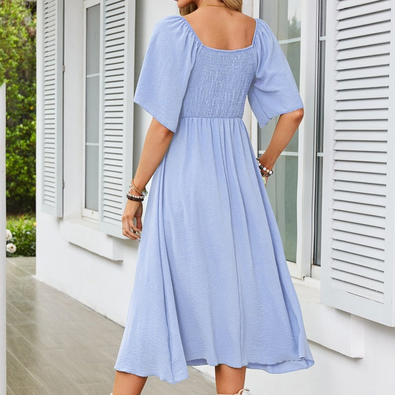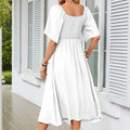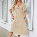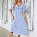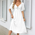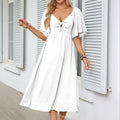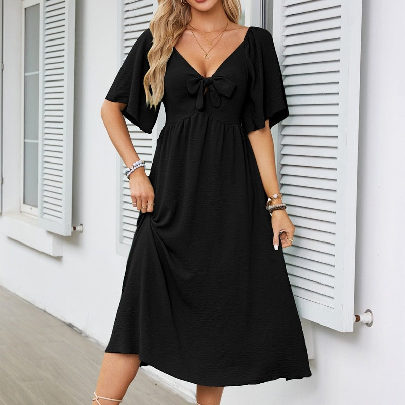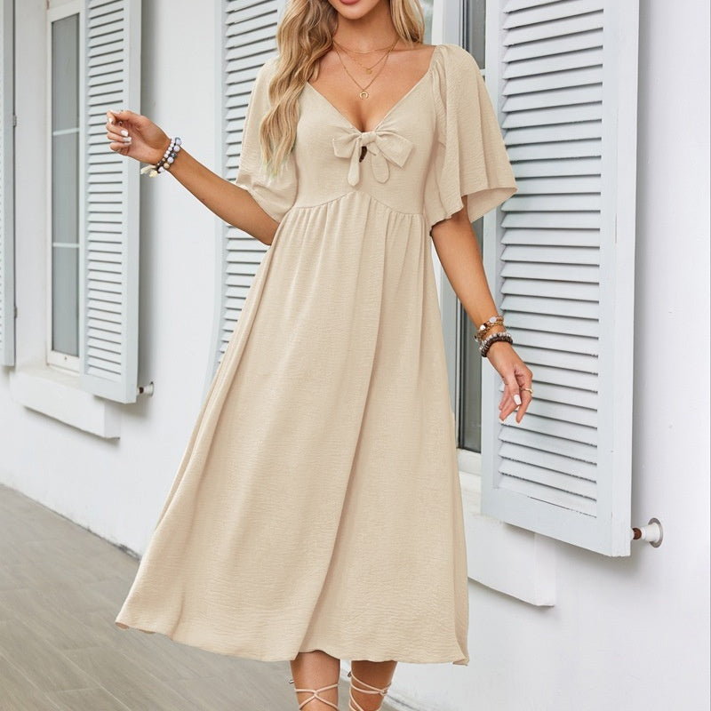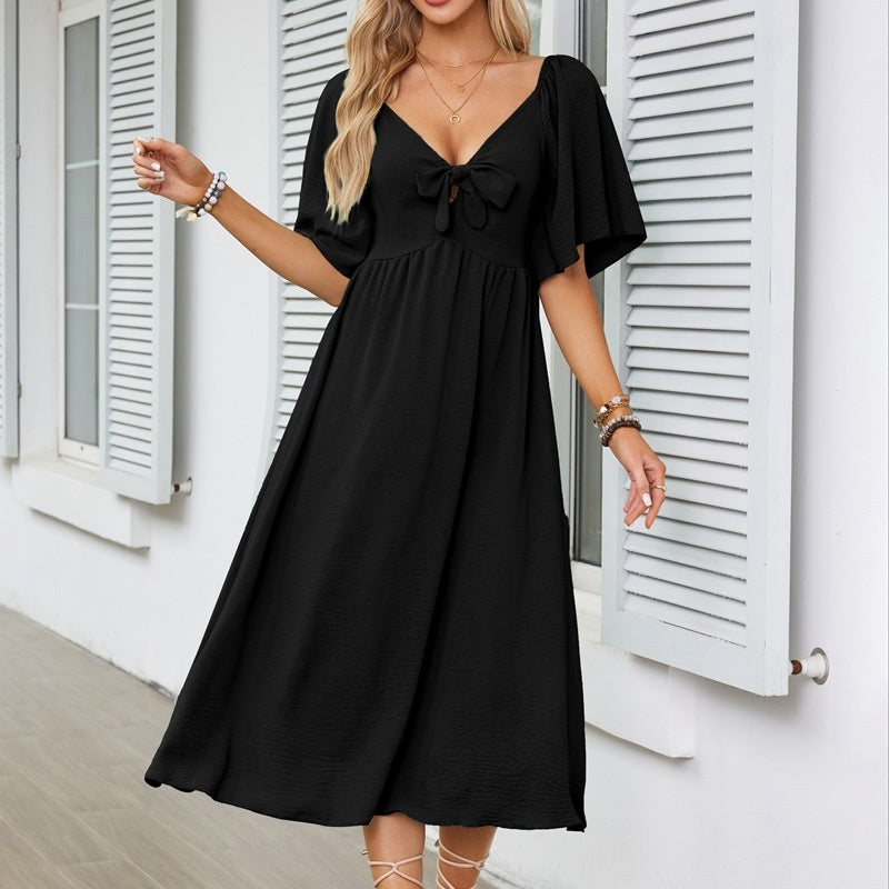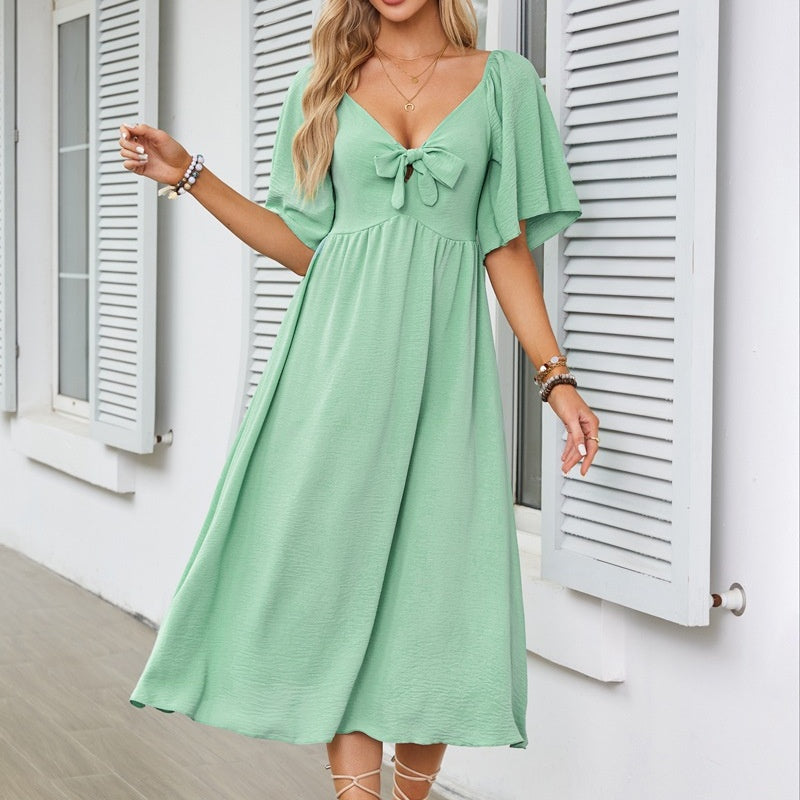 FLATTERING V-NECK & BOWKNOT ACCENT – A deep V-neckline frames collarbones beautifully, while the chic bowknot detail adds romantic flair. Perfect for weddings, dates, or garden parties, this design balances sophistication with playful charm, enhancing curves without compromising comfort.