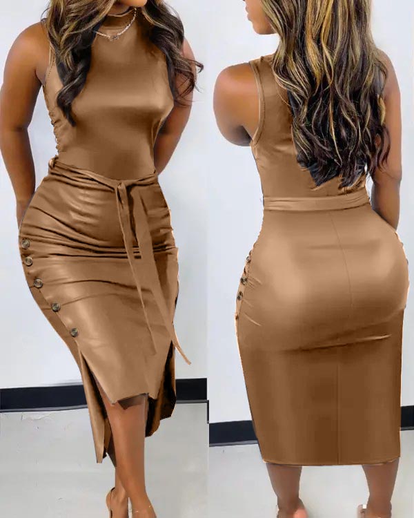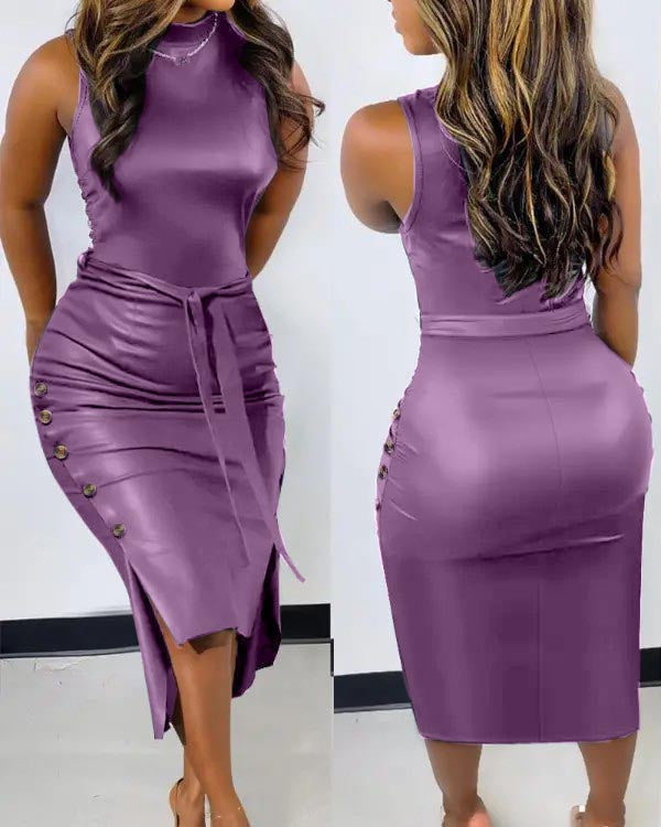 Buttoned Split Hem PU Leather Tie Waist Bodycon Dress