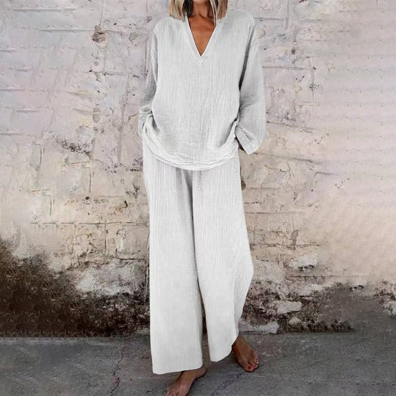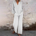 Casual Solid Color V-Neck Long Sleeve Top & Wide-Leg Pants Set