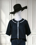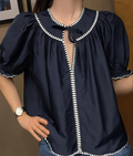 Contrast-Stitch Trim Urban Puff Sleeve Lace-Up Blouse