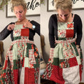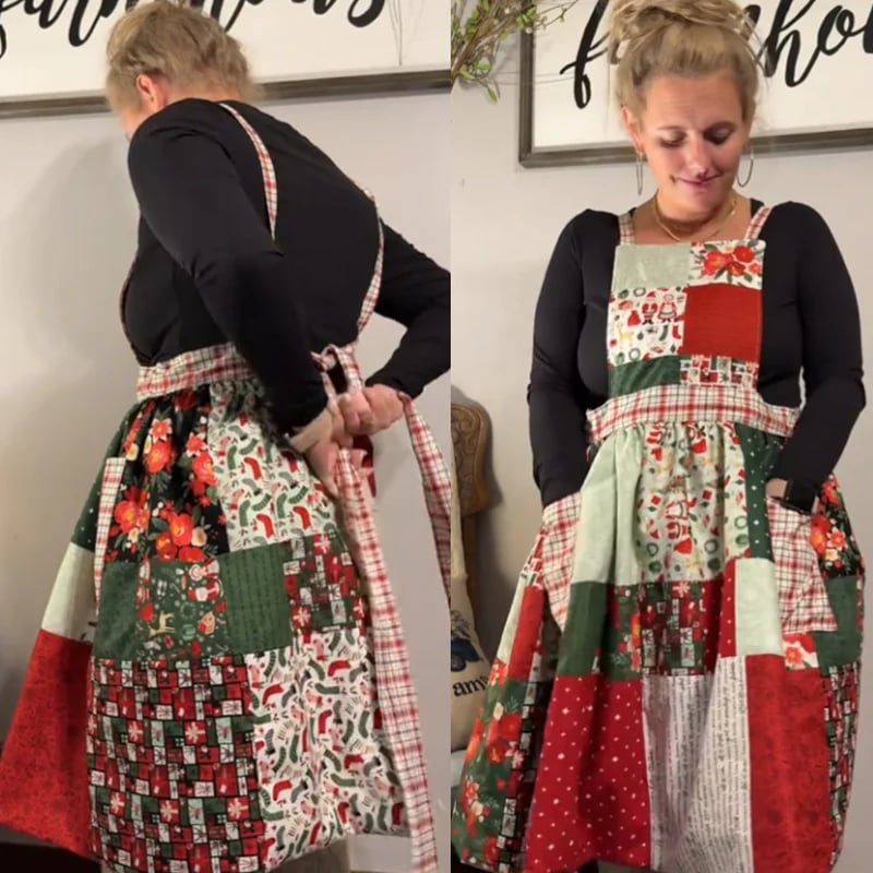Every apron is a beautiful blend of Christmas prints — think holly berries, Santa motifs, plaid, and poinsettias — stitched together in a timeless quilted design that feels like a hug from home.
