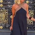CHIC CROSS HALTERNECK DESIGN: The dress features a trendy cross halterneck that adds a sophisticated and modern twist to your outfit. Perfect for evening events, weddings, or any stylish occasion, it makes a bold fashion statement.
