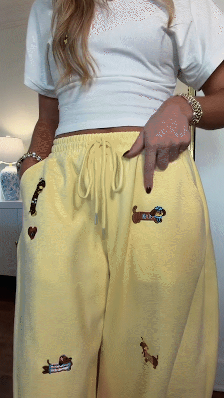 These embroidered puppy-print loose-fitting leggings are both cute and comfortable. Sweet yet cool, these leggings are the perfect everyday wear—whether relaxing at school, grabbing a coffee, or hanging out with friends.