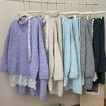 Delicate lace splicing along the hem and ribbon creates a stunning contrast against the soft knit fabric. A subtle detail that elevates the outfit to a premium, luxurious look.
