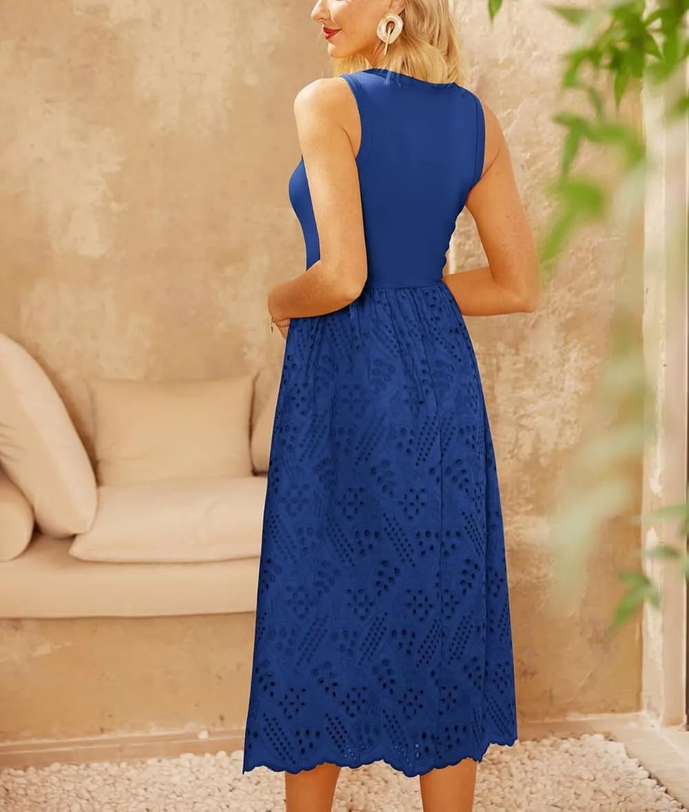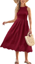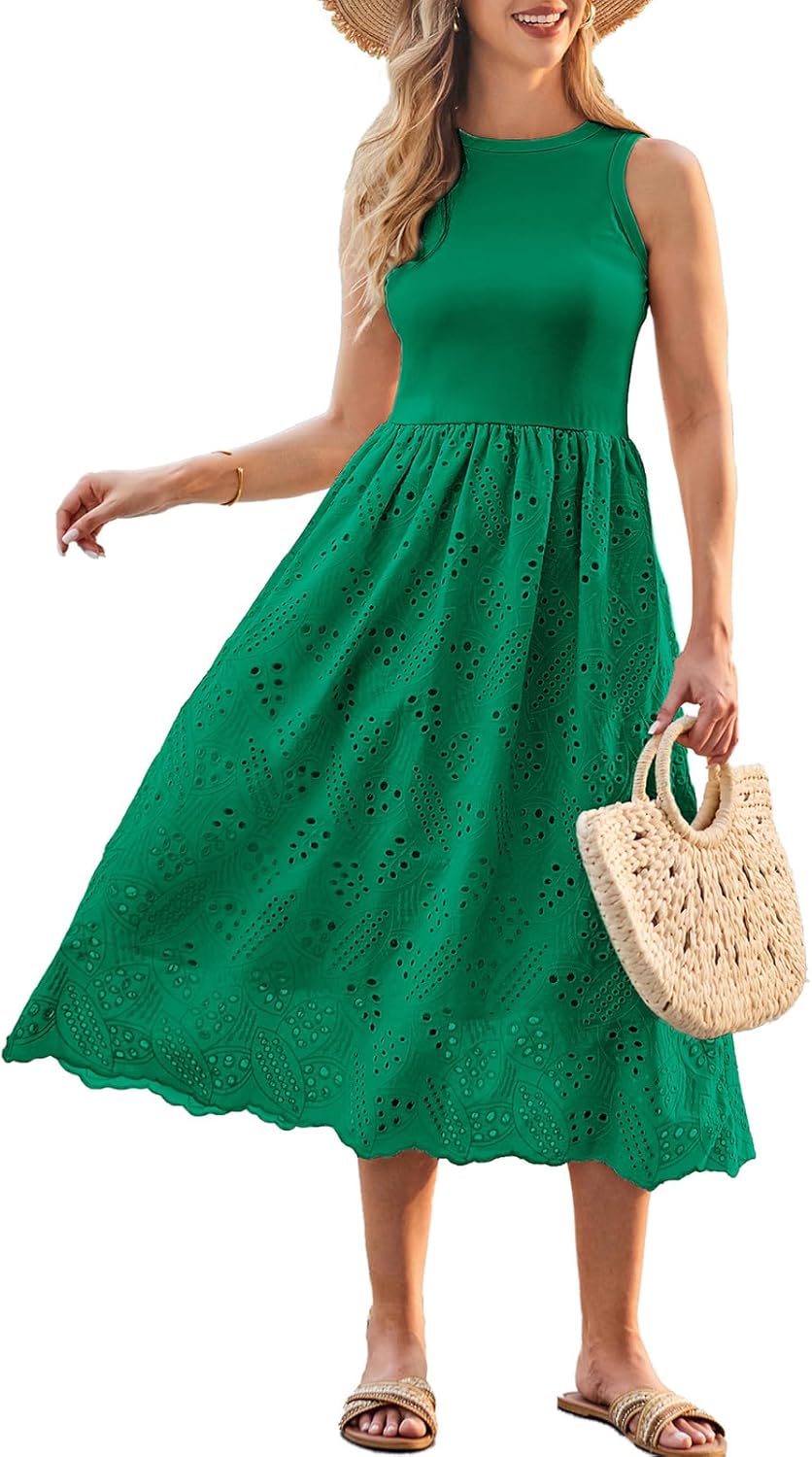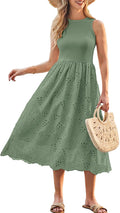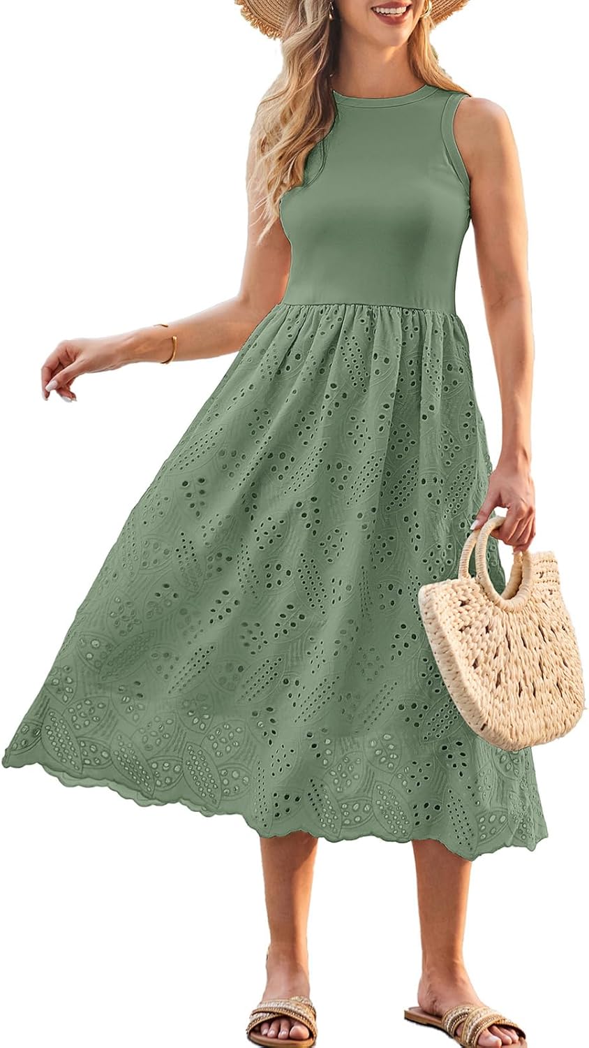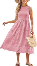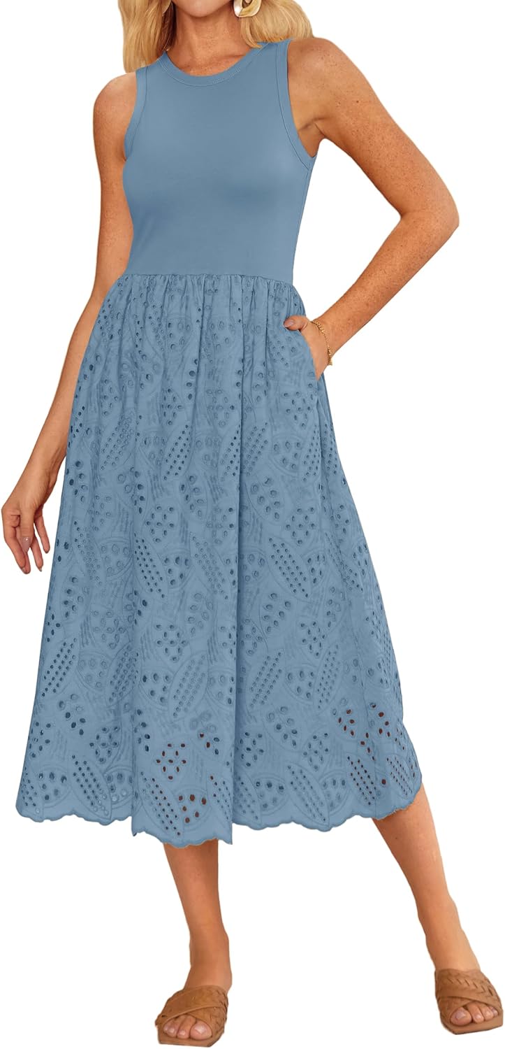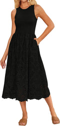 Elevate your summer style with our Eyelet Crewneck Casual Sleeveless Tank Dress With Pockets. Crafted for comfort and versatility, this dress is perfect for any occasion, whether it's a casual outing or weekend brunch. Stay chic and effortless with this wardrobe essential.