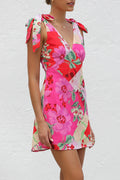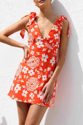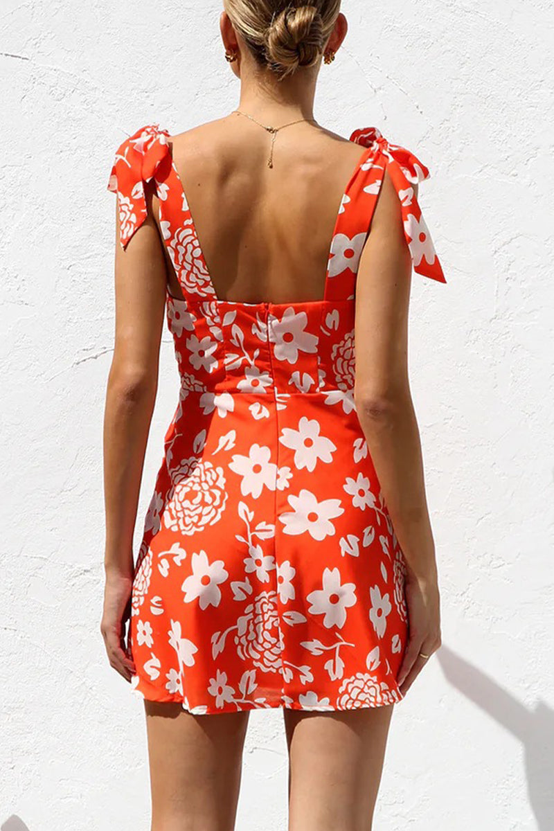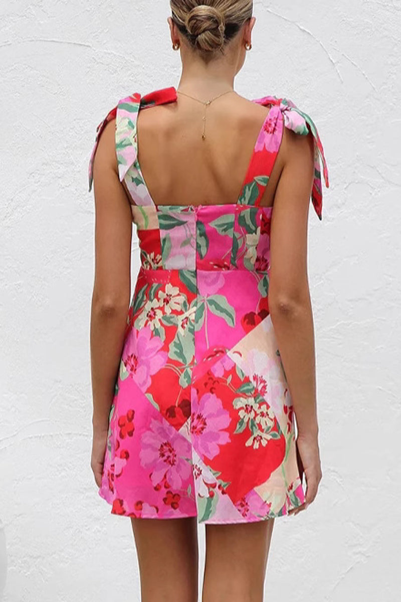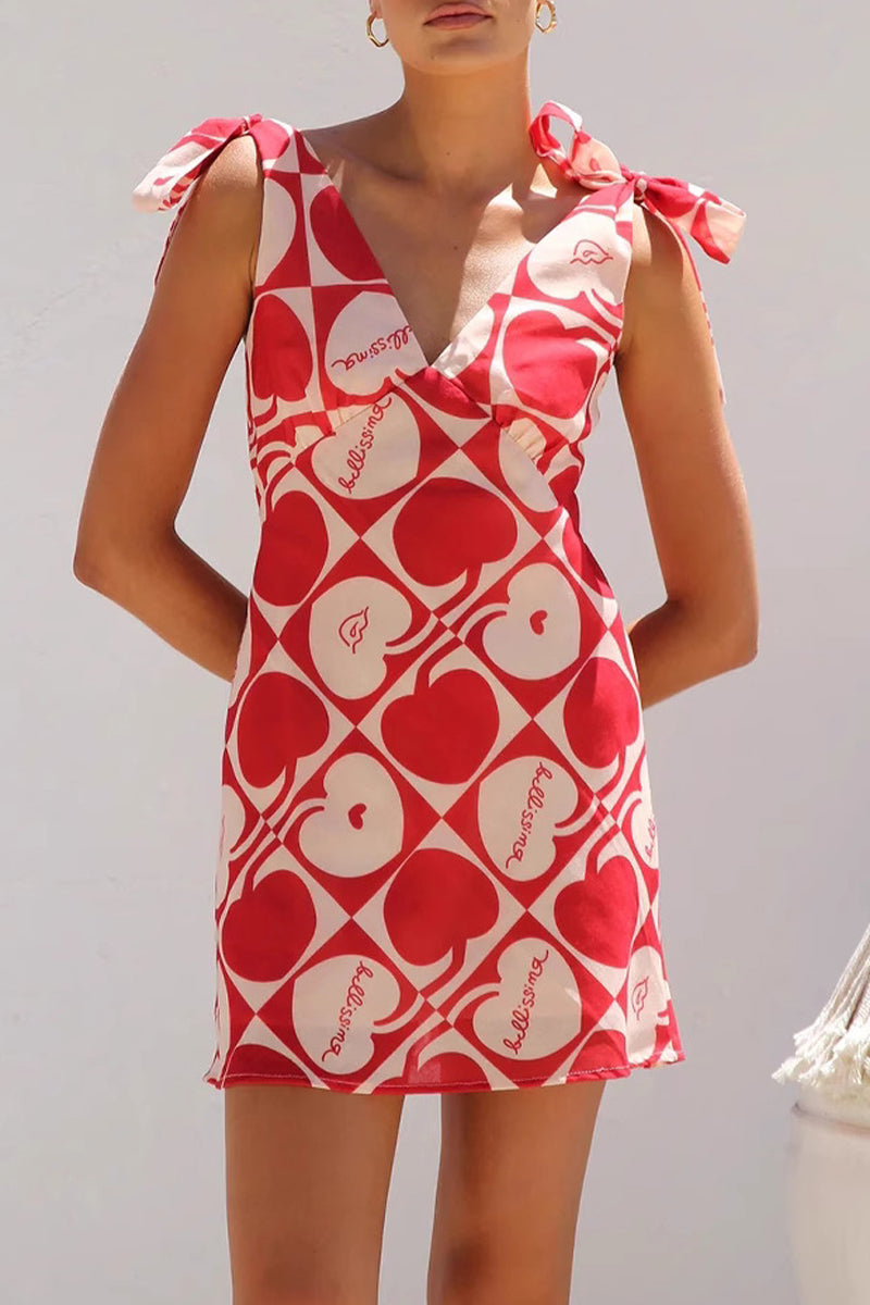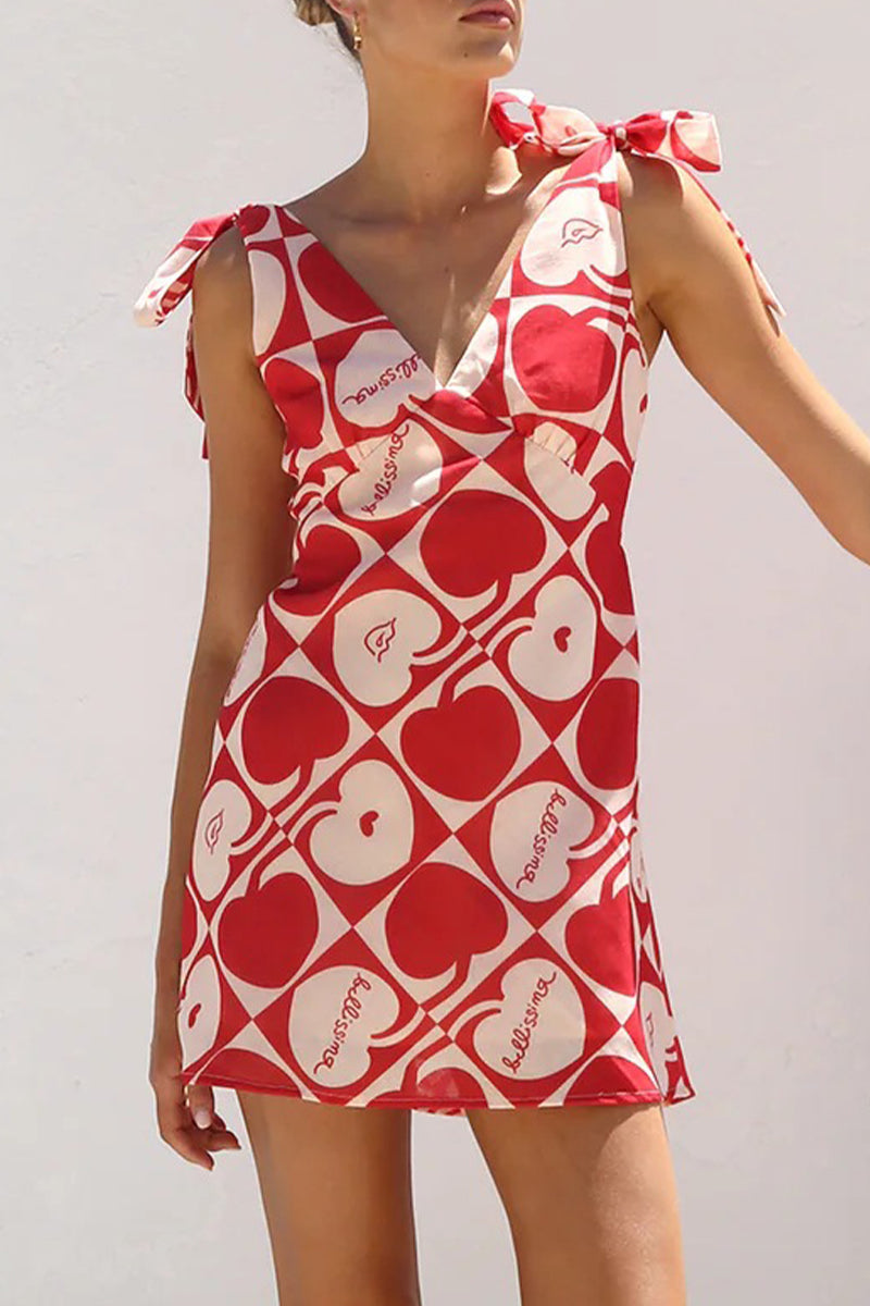 Floral Print Heart Shaped Lace Up V Neck Printed Dresses
