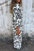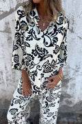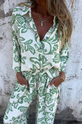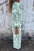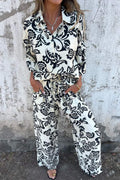 This chic floral print two-piece set combines elegance with comfort, making it a perfect choice for casual outings or relaxed gatherings. The set includes a stylish button-up top and coordinating wide-leg pants, featuring a beautiful print design that adds a touch of sophistication.
