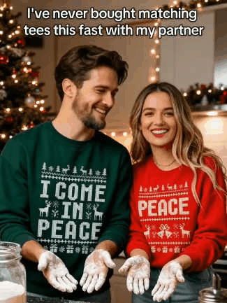 Show off your humor with quirky sayings and colorful prints — because Christmas outfits should bring smiles! “I Come in Peace” and other couple-themed designs make for perfect conversation starters.