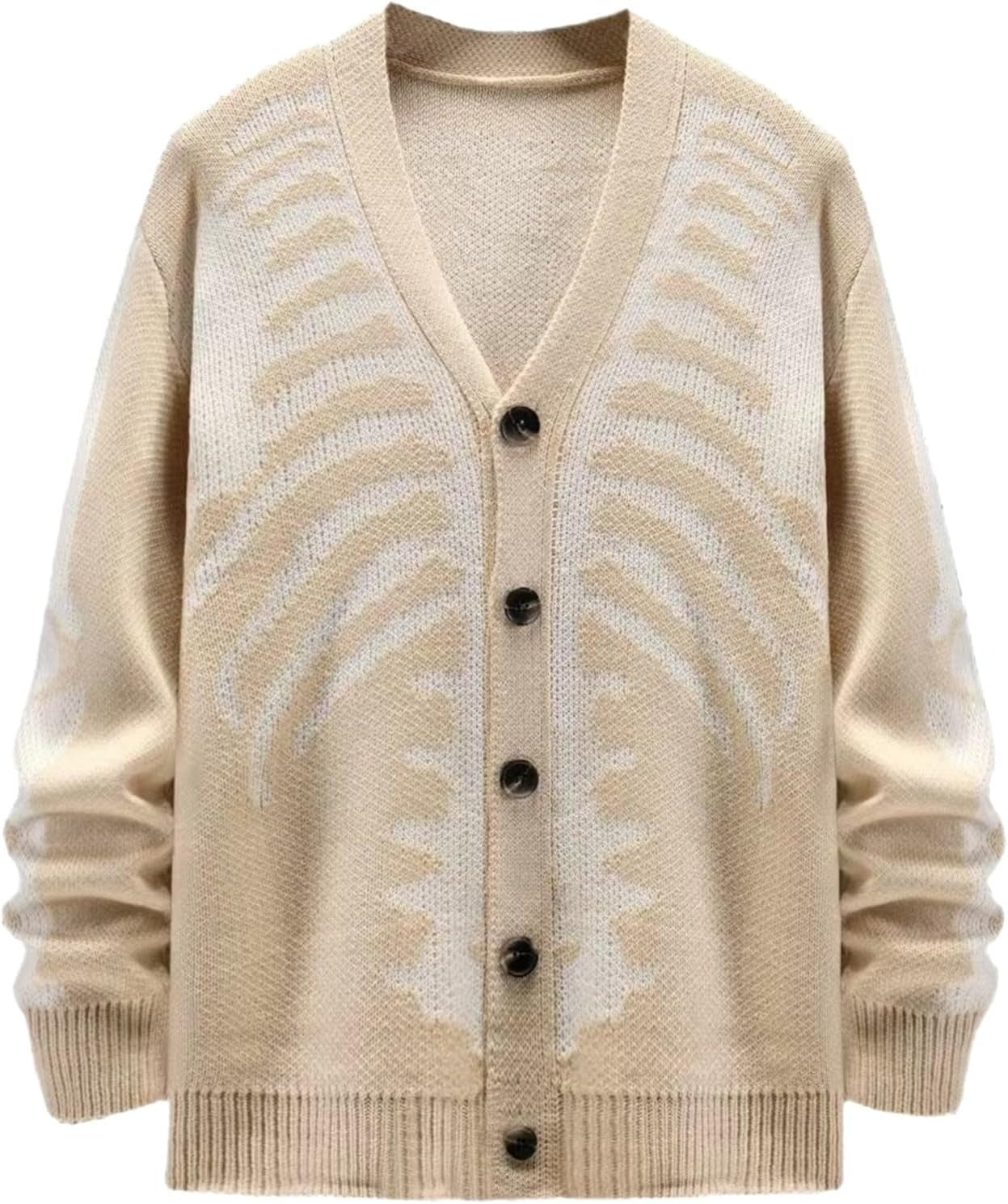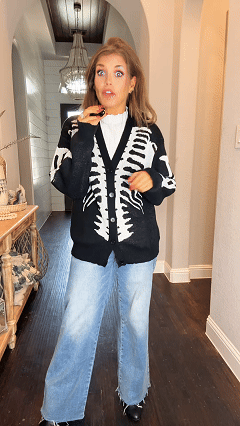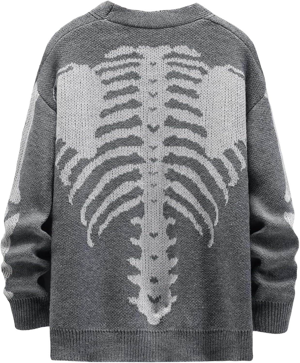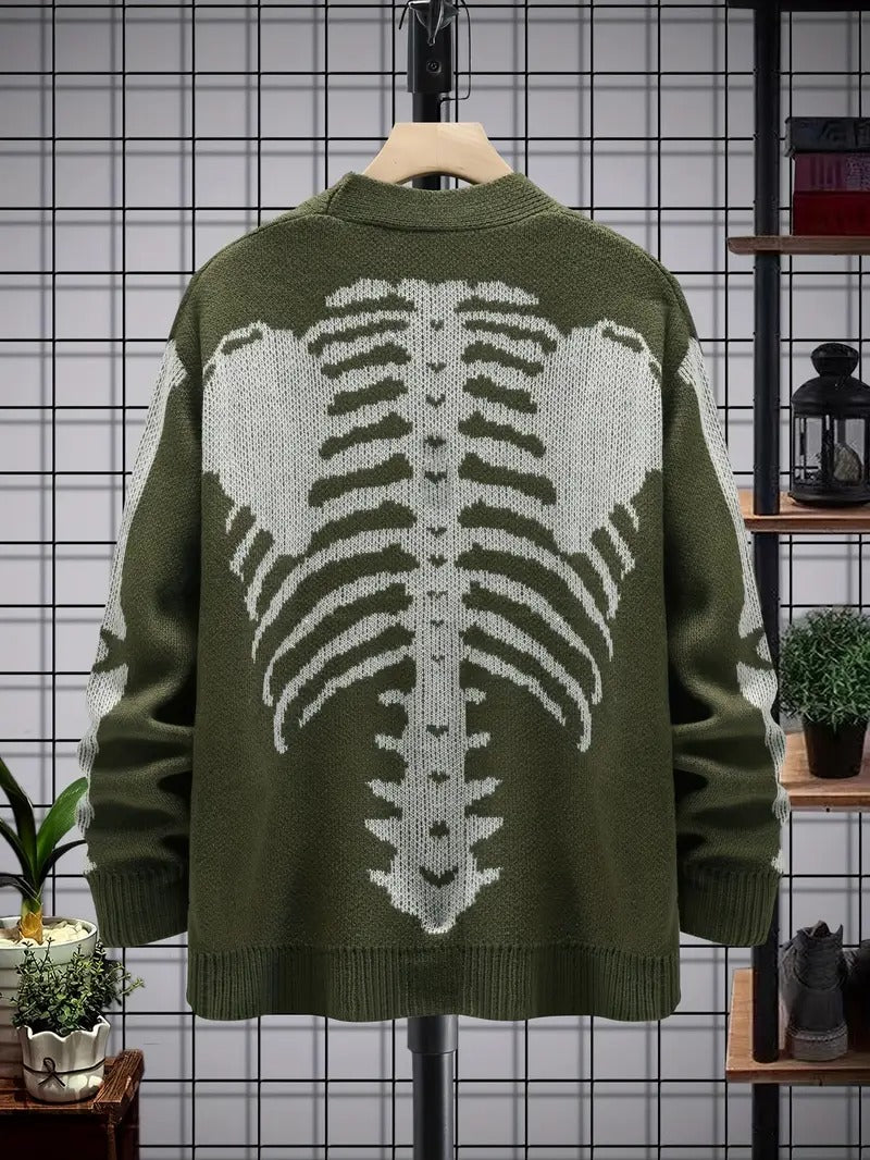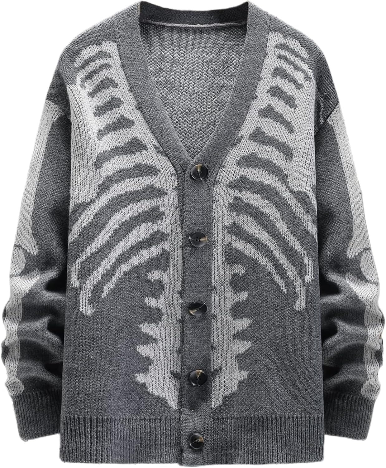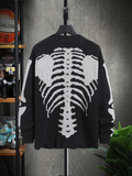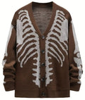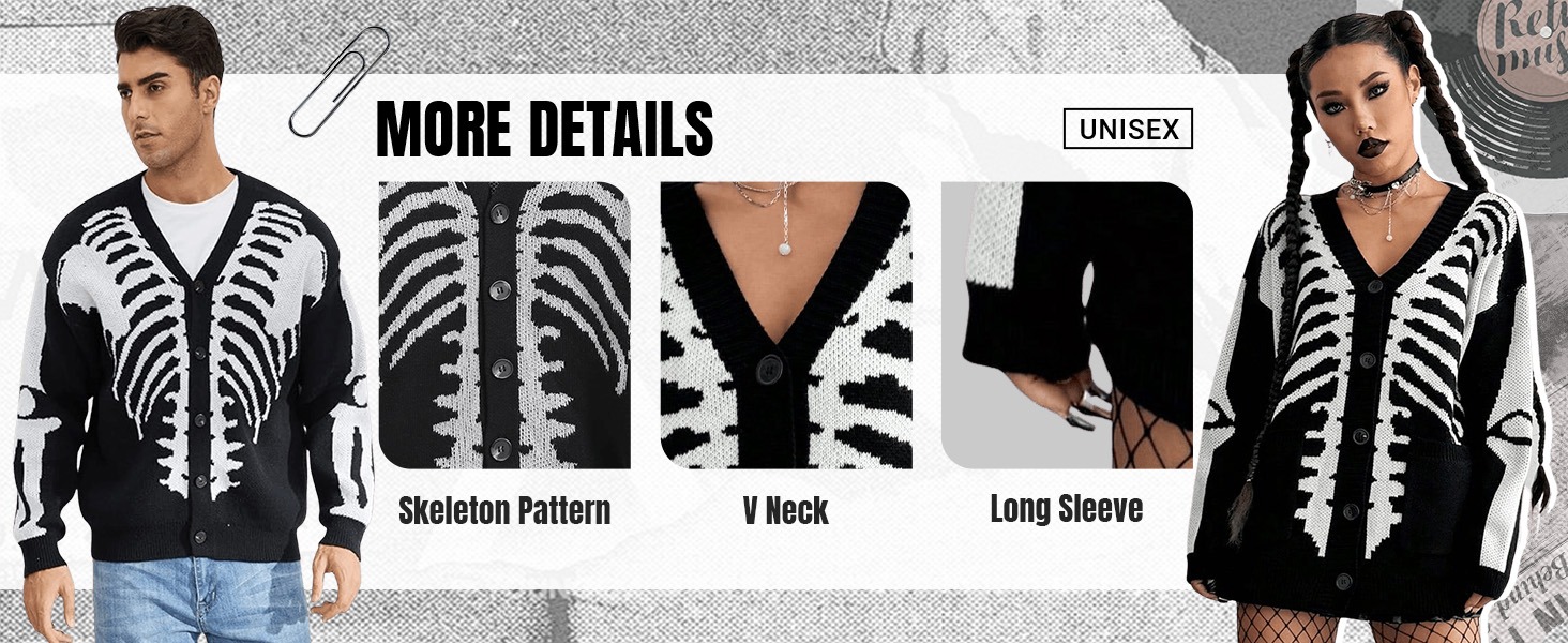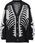 Add a spooky twist to your wardrobe with this Skeleton Print Button-Up Cardigan, featuring a bold skeleton design and classic V-neckline. The oversized fit offers both comfort and style, making it perfect for layering over your favorite tops. With its playful yet edgy look, this cardigan is a great choice for adding a statement piece to your casual outfits, especially during the Halloween season. Pair it with jeans or leggings for a fun and cozy look.