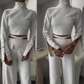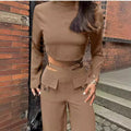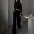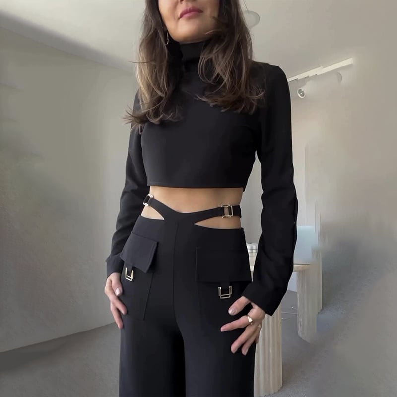 Paired with the flare pants, which are designed with a trendy cutout waist and functional pockets, this set delivers both style and practicality.