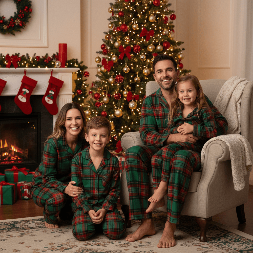 Dress the whole family in matching festive cheer with our Classic Plaid Christmas Pajamas! Made from a premium blend of 70% cotton and 30% polyester, these pajamas offer the perfect balance of softness, breathability, and durability — keeping everyone comfy from Christmas Eve to lazy winter mornings.