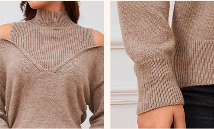 Warm, soft, and a little flirty — this sweater gives “effortlessly cute” vibes all day. The off-shoulder cut and turtleneck combo make it perfect for cozy coffee dates or nights out. Dress it up with leather pants or keep it chill with jeans.