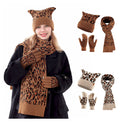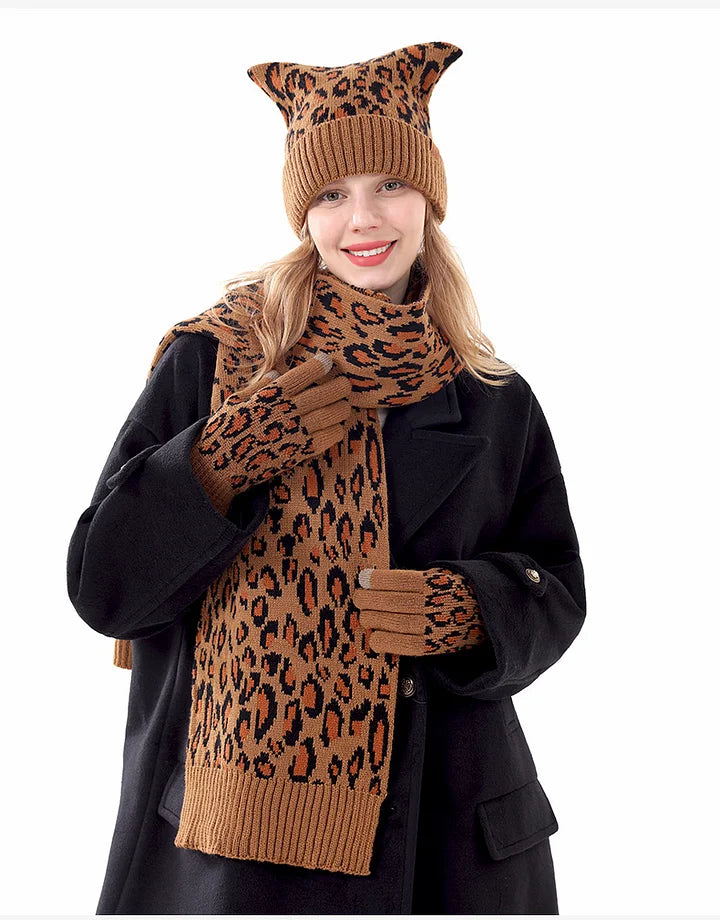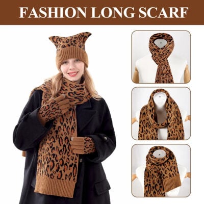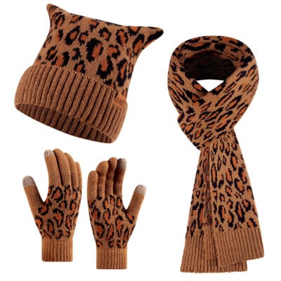 The hat is constructed with a stretchable knit to accommodate most adult head sizes. The scarf offers ample length for versatile styling and additional neck coverage. Gloves are designed with flexibility to allow hand movement while retaining warmth. The set is suited for activities such as walking, hiking, or seasonal daily use.