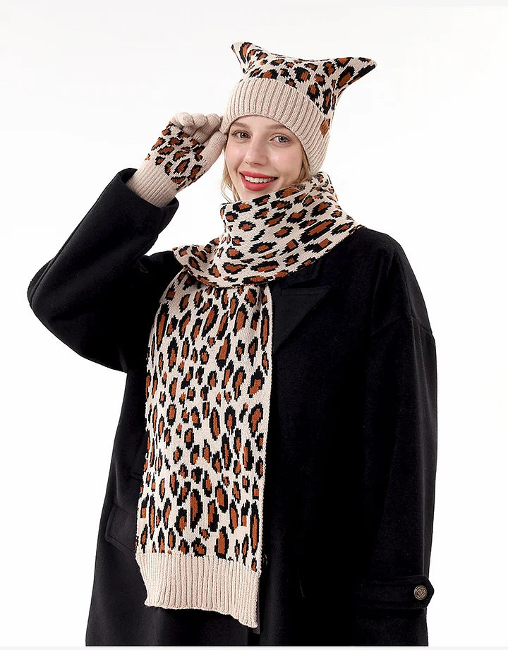 This three-piece winter set includes a fleece-lined hat, scarf, and gloves, designed for cold weather conditions. The thermal lining and soft knitted exterior provide warmth and comfort during daily wear or outdoor activities. The set is made from polyester and is available in classic neutral color options.