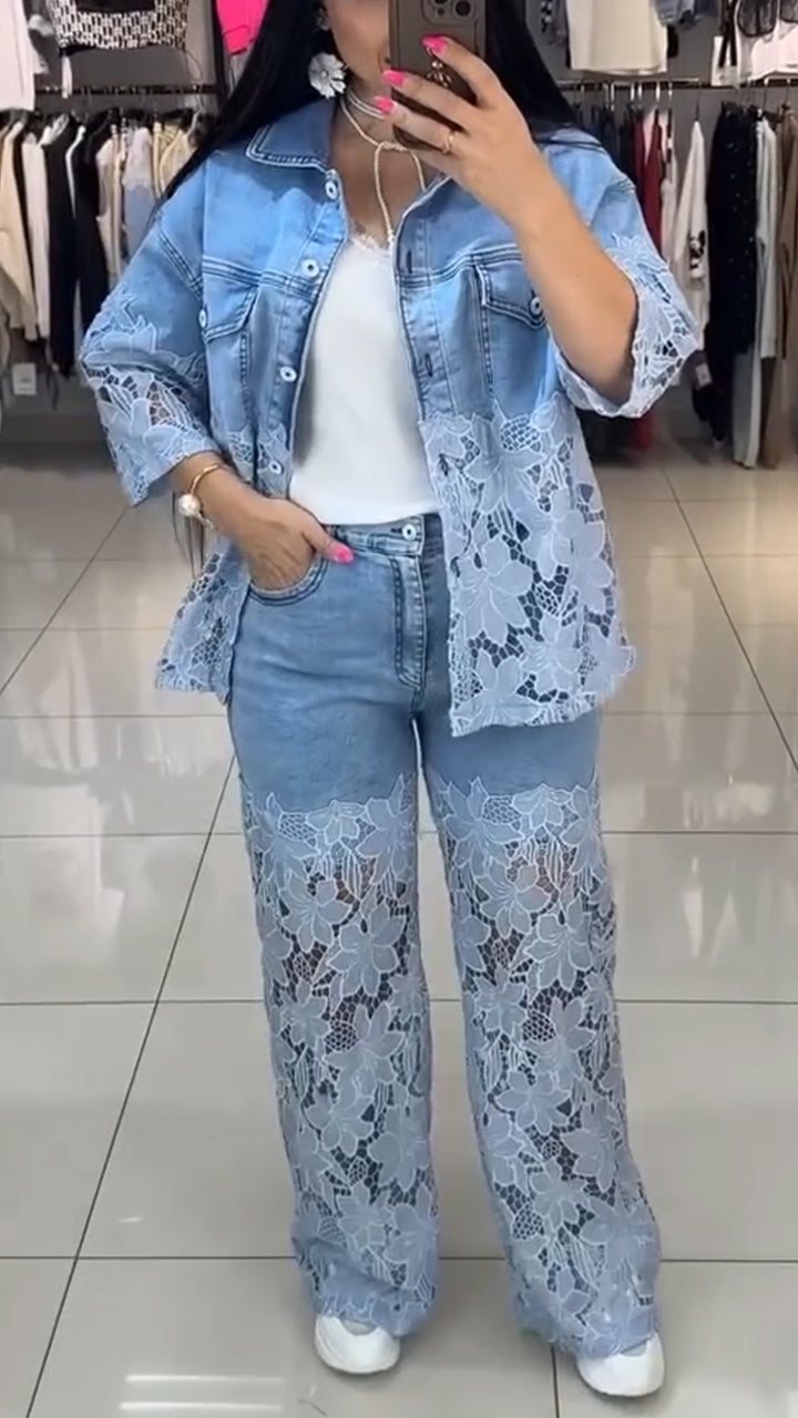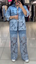 Ladies' Lapel Print Hollow Splicing Casual Set