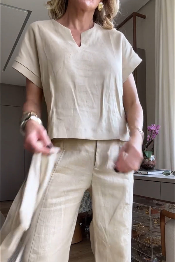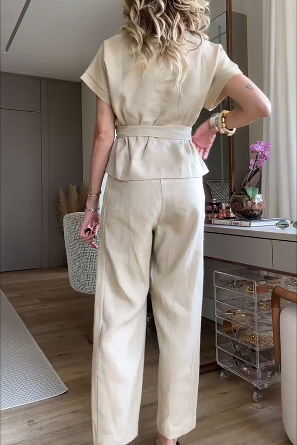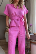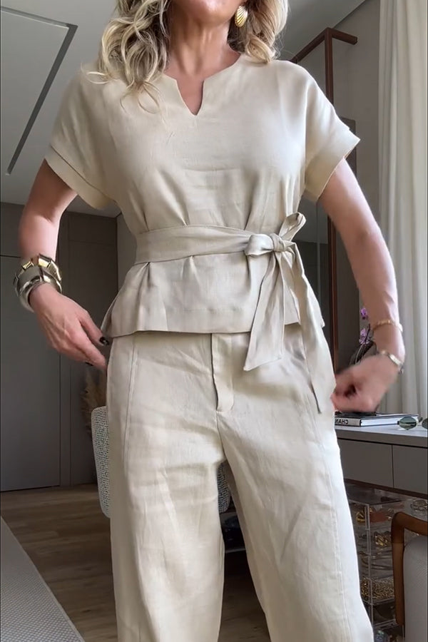 Linen Blend Tie-up Short Sleeve Top Pants Set