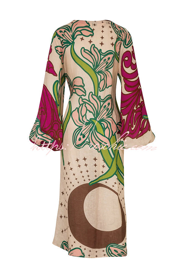 Linen Blend Unique Print Balloon Sleeve Tie-up Tunic Maxi Dress