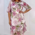 FLOATING RUFFLES - Layers of lightweight chiffon ruffles mimic blooming roses and extend from the neckline to the hem. Delicate embroidered flowers adorn the half sleeves, blending vintage glamour with modern movement. Ideal for garden parties, weddings or brunches, gentle drama takes center stage.