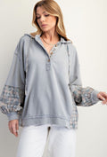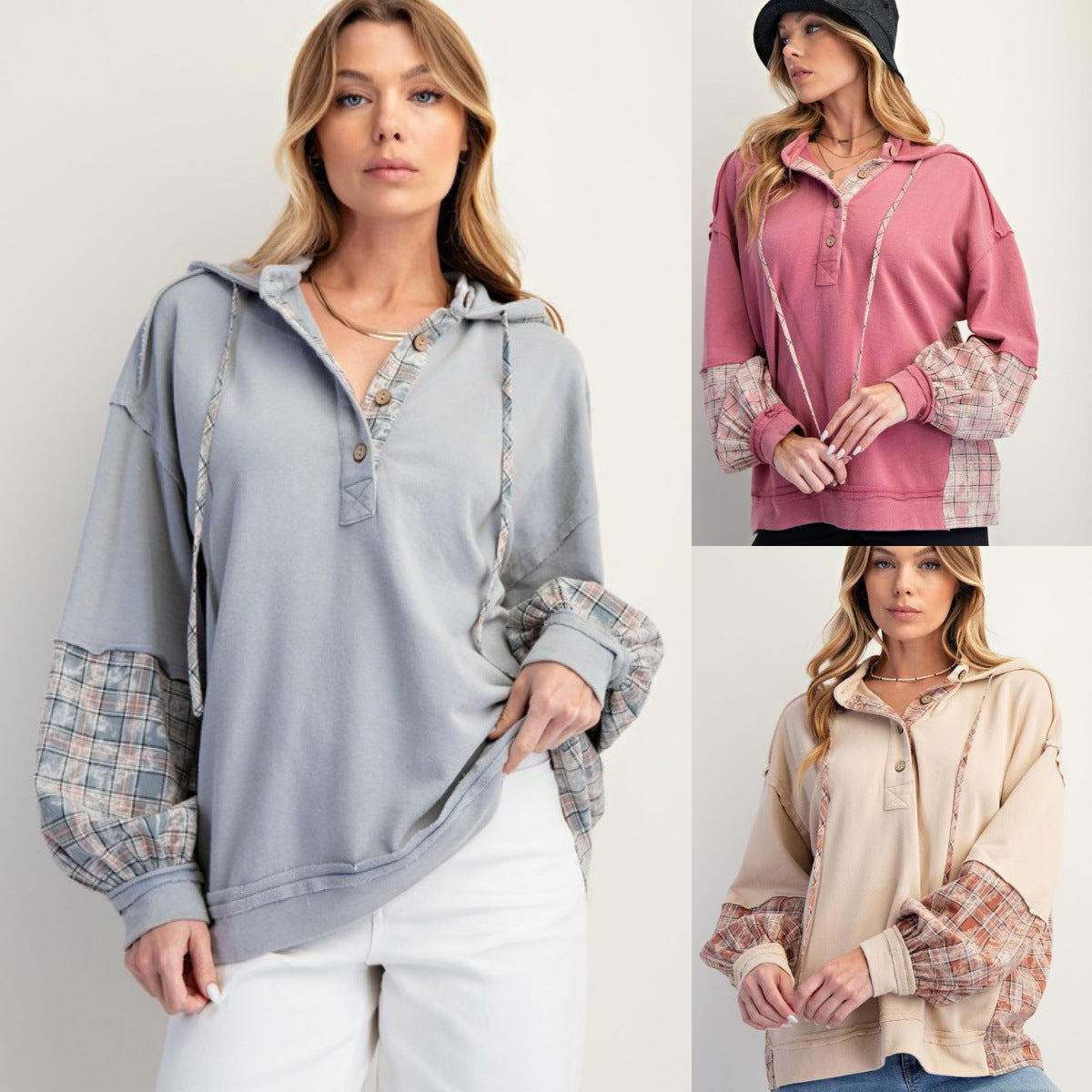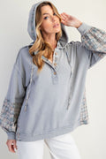 Plaid Mix Pullover Hoodie with Button Placket and Adjustable Hood