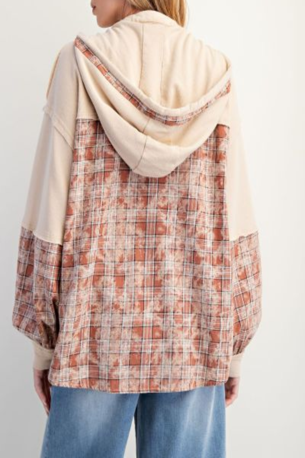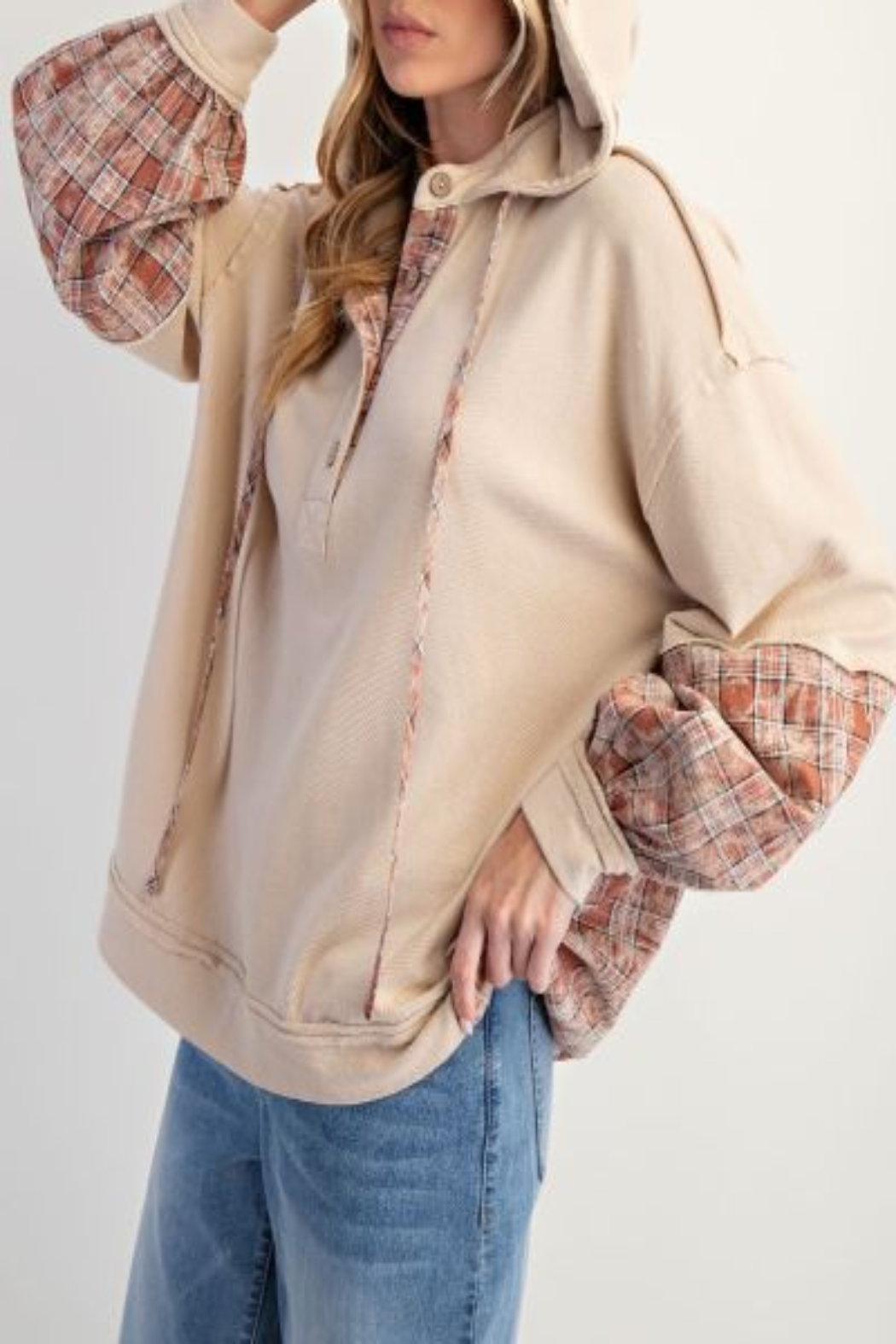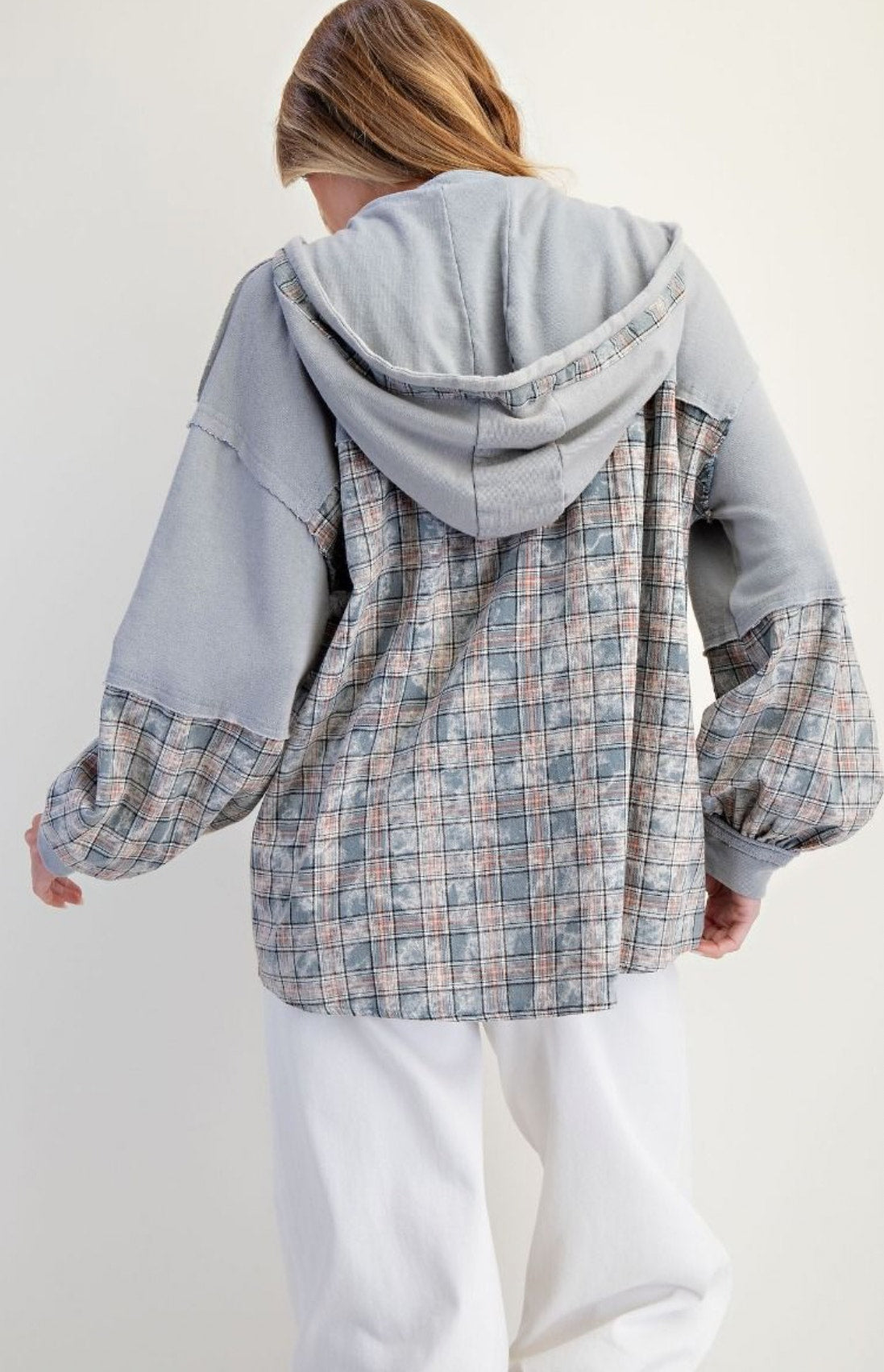 Experience relaxed comfort with the Plaid Mix Pullover Hoodie. Designed with a front button placket and drop shoulder construction, this hoodie combines a laid-back silhouette with thoughtful details. The long balloon sleeves are finished with elastic cuffs for a secure fit, while the adjustable hood with drawstrings offers personalized coverage.