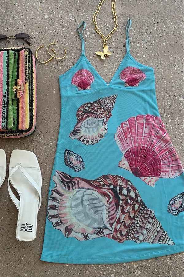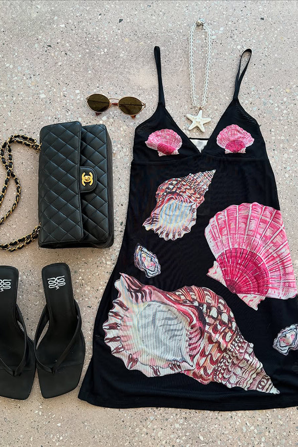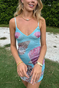 Playful and Flirty Mesh Shell Print Slip Stretch Mini Dress